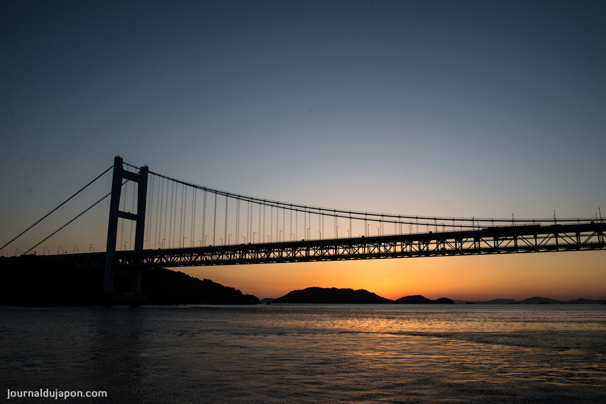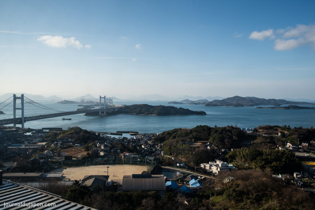 Encore un peu plus haut se trouve le parc du mont Washuzan qui offre une vue imprenable sur le pont de Seto et la mer intérieure ; un paysage saisissant qui donne envie d’aller voir la mer de plus près. Justement, suite à l’inauguration du pont de Seto en 1988, un port de plaisance a été crée à Kojima, à proximité du mont Washuzan. On peut y embarquer pour une petite croisière qui offre des panoramas magnifiques au crépuscule sur le pont, mais aussi, plus surprenant, sur la zone industrielle de Mizushima qui s’illumine à la nuit tombée.