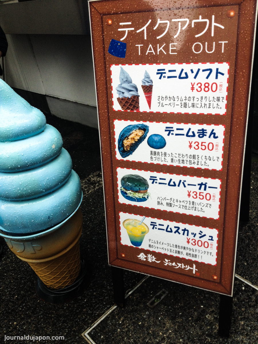 Mais ce n’est pas tout : le quartier entier est habillé aux couleurs du blue jeans. Des pantalons sont accrochés au milieu de la rue, l’asphalte est teinté spécialement, les plaques d’égout indiquent la couleur et le reste du mobilier urbain (distributeurs de boissons, cendriers, poubelles …) est tout de jeans vêtu. On peut même y déguster des brioches vapeurs, des burgers ou des glaces couleur indigo !