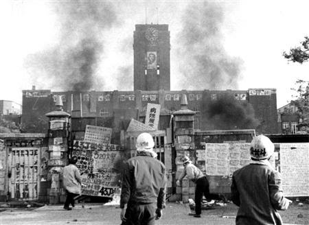 En février 1968, 71 établissements connaissent des troubles et 26 sont bloqués : plutôt que d’agir immédiatement, les autorités décident de laisser les conflits se décanter sur les campus, puis de faire intervenir la police à la faveur de la loi du 17 août 1969 autorisant ce type de maintien de l’ordre. Avant cela, cette reprise en main est passée en 1969 par un événement qui connut une forte médiatisation, et fut suivi en direct à la télévision, la « prise de la forteresse Yasuda », du nom de l’amphitéâtre de l’université de Todai où sont retranchés des centaines d’étudiants. Le 19 janvier 1969, 8 000 policiers sont mobilisés pour les déloger, mais les étudiants répondent à la tentative d’expulsion par des chants révolutionnaires ainsi que des jets de cocktails Molotov et de bouteilles d’acides. Trois jours furent nécessaires aux forces de l’ordre pour les expulser, et plus de 600 étudiants sont arrêtés. Cet événement marque la fin symbolique du mouvement de Mai 68, et le début de l’effritement des soutiens populaires.