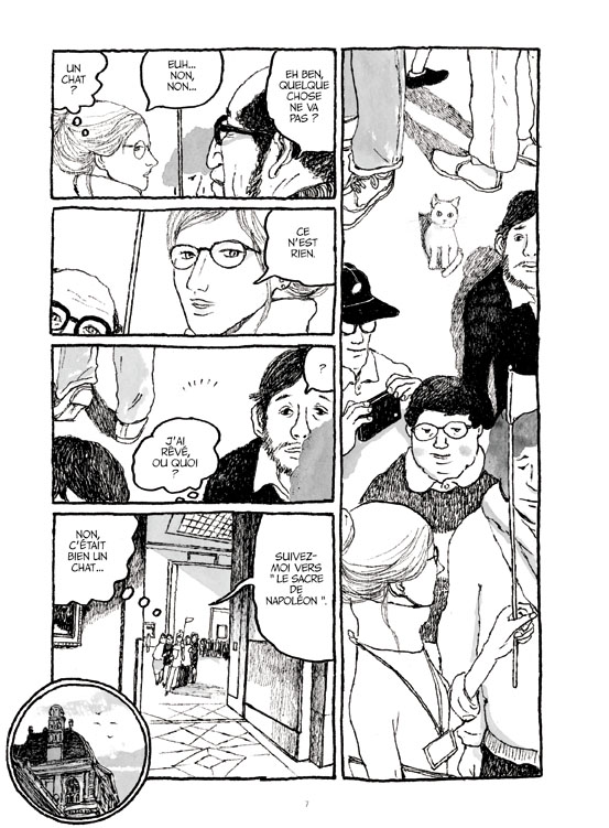 Le lecteur pénètre dans le Louvre avec des touristes qui photographient la Joconde avec leur smartphone. Cécile, la jeune guide, s’attriste de ne pouvoir montrer que les œuvres les plus connues, au détriment de trésors oubliés. Marcel, le vieux gardien, fait son tour de ronde avec le jeune Patrick qui vient d’arriver. Il nourrit les chats très nombreux qui habitent sous les toits.