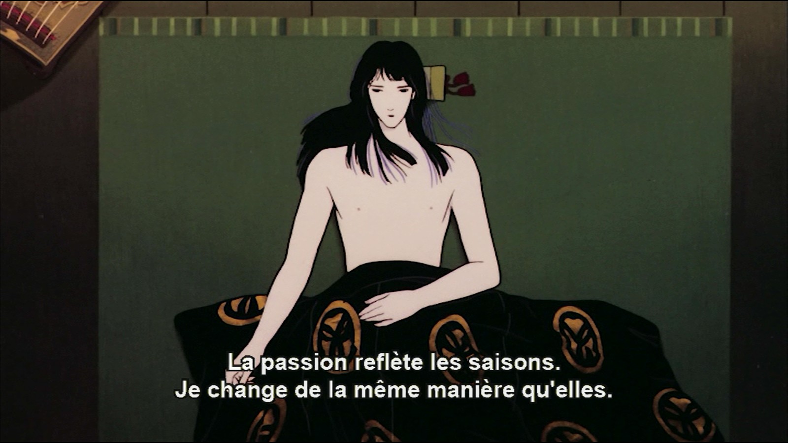 Il en va de même pour les dialogues : les personnages communiquent entre eux en utilisant le langage soutenu de la cour, quelque soit les relations qu’ils entretiennent. Les émotions sont, à l’image du roman, exprimées en Waka, et dévoilent poétiquement toute la profondeur des sentiments éprouvés par les personnages. Et dans toute cette beauté des mots, on devine une certaine mélancolie omniprésente dans le cœur du Genji qui semble constamment à la recherche de quelque chose qui pourra enfin le faire sentir complet et en paix avec lui-même.