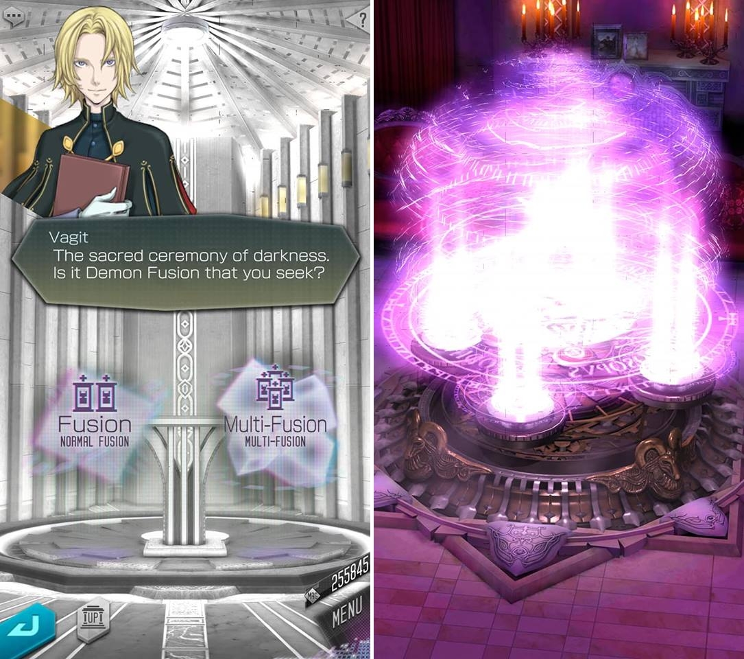 Différents moyens pour obtenir les quelques 160 démons se présentent à nous : le recrutement par des phases de dialogue qui apparaissent de façon aléatoire lors des combats ; l’achat en échange de Gems au «Summuning Portal » (Portail d’invocation) ; et la fusion de 2 ou plusieurs démons dans la « Church of False Gods » (Église des Faux Dieux). Les monstres pourront même évoluer (gagner une étoile et gagner en force) lorsqu’ils atteignent le niveau max. Le téléphone portable de notre personnage joue le rôle de Pokedex (Pokemon) où l’on peut voir les différents monstres à collectionner mais surtout une fois possédés, on a accès à leurs forces et faiblesses, informations très utiles pour les futurs combats. D’ailleurs, lors des combats, on tapant deux fois sur les monstres adversaires, on a accès à tout cela s’ils font déjà partie de nos alliés.