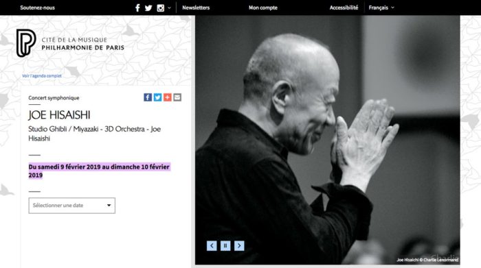Le compositeur Joe Hisaishi sera de retour en France pour deux concerts exceptionnel les 9 et 10 février 2019 à la Philharmonie de Paris. Les deux concerts sont bien évidement complet depuis des mois.