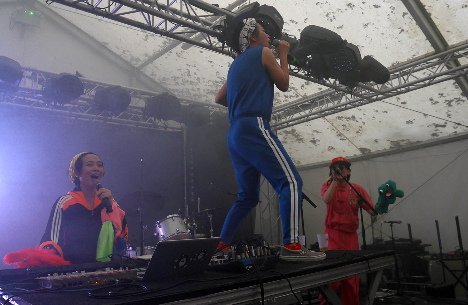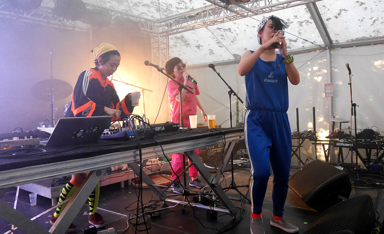 Et puis MTG (chant, claviers, samplers), PKNY (chant, claviers) et Chiyaji (chœurs, scénographie) montent sur scène avec leurs dégaines pas possible, et on est transporté. « Le nom de notre groupe vient entre autres du Casiotone (un clavier produit dans les années 1980 par Casio, ndlr) dont nous nous servions beaucoup à nos débuts » explique MTG. Et l’esprit des années 80-90 est bien présent avec CASIO Turkey Onsen. Dans l’esthétique, d’abord, puisqu’elles arborent survêtements vintage et tangzhuang aux couleurs fluo pétaradantes. Dans la musique aussi, évidemment, puisqu’elles s’imprègnent largement de sonorités électroniques de cette période, entre nappes de synthétiseurs et boîtes à rythme assez primitives.