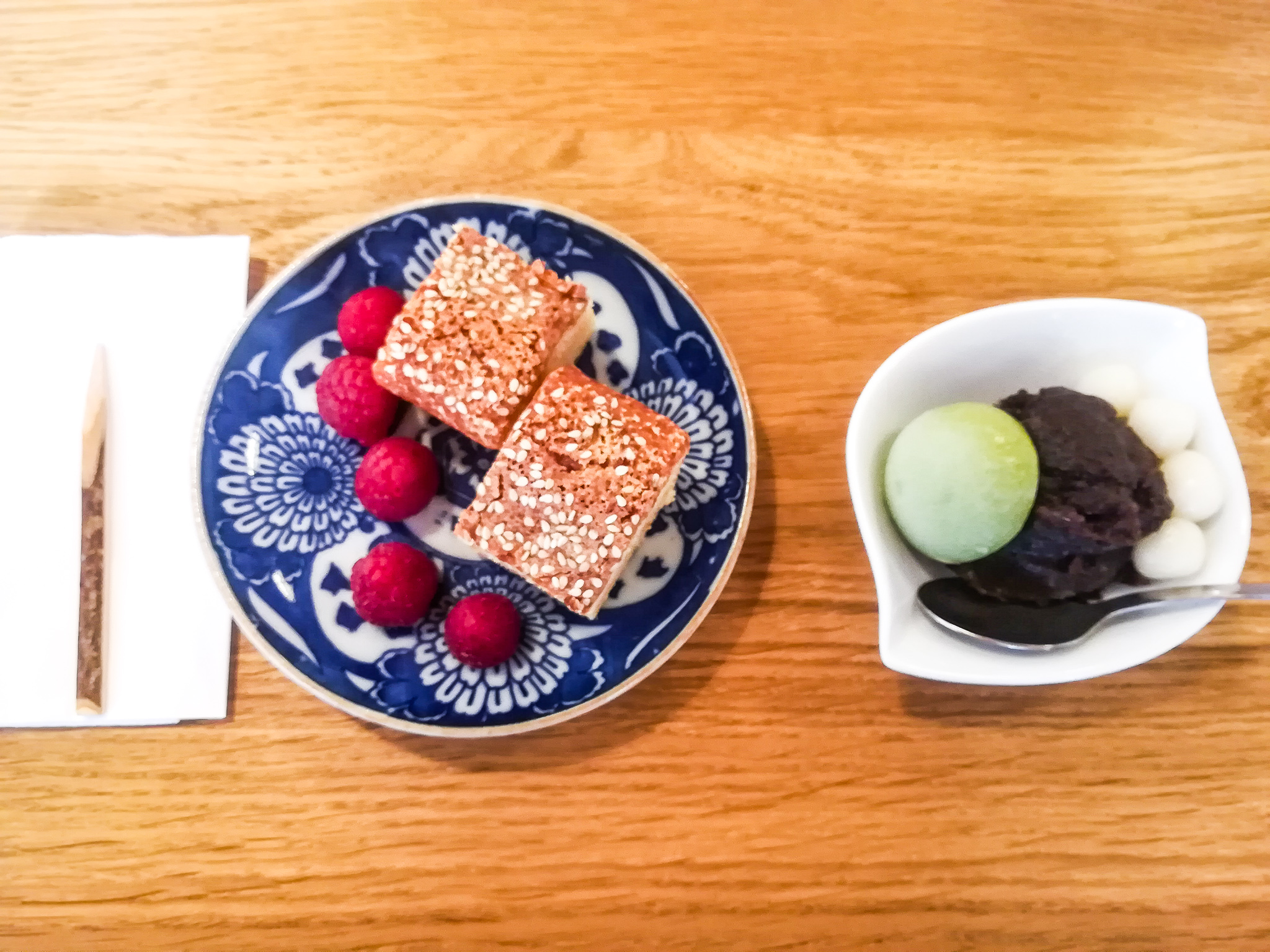 Les desserts sont faits maison : anko, glace, shiratama … Quelquefois, ils se donnent même quelques défis en proposant des desserts atypiques et clairement inconnus du grand public, comme par exemple le misômatsuzake, un wagashi moelleux saupoudré de graine de sésame, et spécialité de Kyôto.