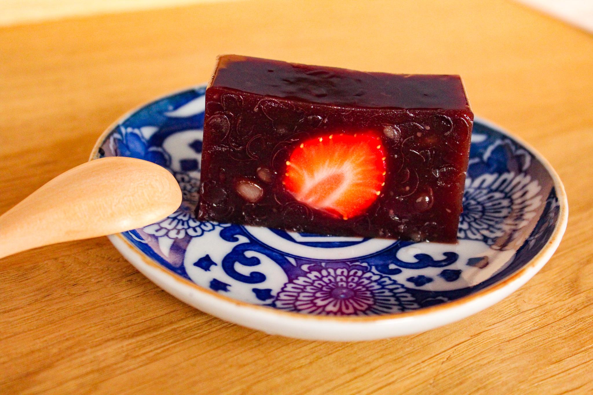 Avez-vous déjà goûté le yokan ? Peut-être pas. C’est l’occasion ! Cette douce gelée de haricots rouge est excellente avec un bon thé vert, et le chef Adrien y ajoute même une petite touche fruitée en y ajoutant une fraise à l’intérieur.