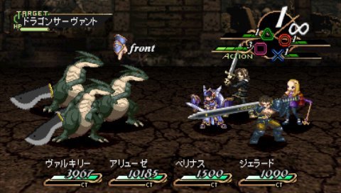 Plusieurs choix s’offrent à vous : une attaque simple, utiliser un objet ou une magie lorsque c’est possible (en fonction des points disponibles), ou passer son tour. VP utilise un système unique de tour par tour, car au lieu de choisir chaque personnage l’un après l’autre et son action, ils seront tous assignés à une touche de la manette (croix, carré, rond et triangle). Cela aura pour but de les faire attaquer, ce qui permet de combiner des attaques rapides et dévastatrices. Plusieurs armes permettent aussi d’enchaîner plusieurs attaques, demandant forcément d’appuyer plusieurs fois sur la même touche. Les personnages utilisant de la magie, eux, pourront intervenir aussi mais leur tour d’action dépendra de leur jauge de « Charge Time », ils ne seront donc pas actifs à chaque fois. Enchaîner les attaques sera parfois nécessaire pour briser la garde d’un monstre et pouvoir enfin lui causer des dégâts.