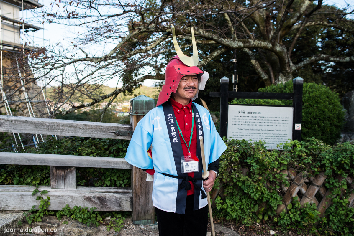 - Un guide au château de Hikone. Il porte le fameux casque cornu des seigneurs de la famille Ii
