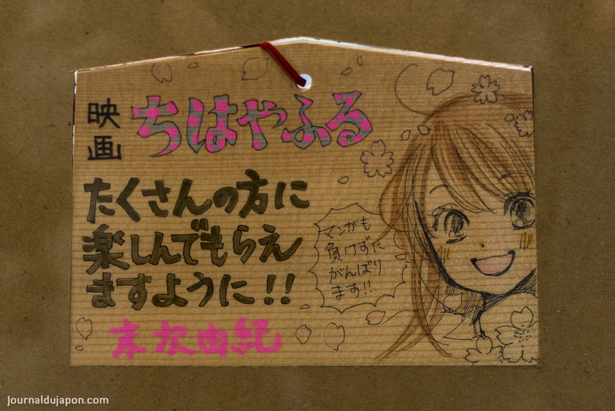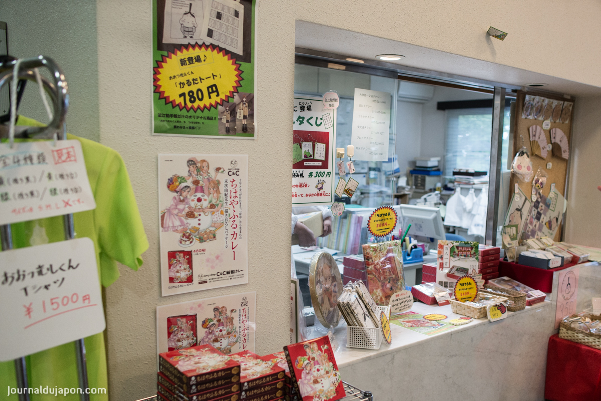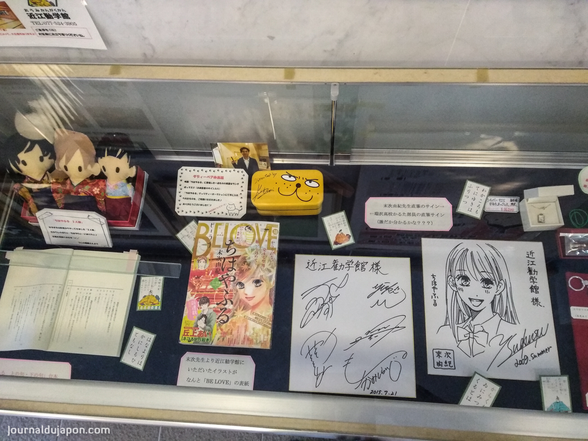 De plus, depuis quelques années, la popularité du manga Chihayafuru et de ses adaptations en anime et en films live a rejailli sur le sanctuaire qui constitue un des principaux décors représentés dans l’œuvre de Yuki SUETSUGU. On trouve ainsi dans le sanctuaire, et surtout dans le bâtiment où se tiennent les compétitions, des effigies des personnages du manga ainsi que tout un tas d’objets commémoratifs aussi bien du manga que du tournage des films. Affiches dédicacées par les acteurs, dessins réalisés par l’auteure. On peut aussi y acheter des jeux de cartes, des goodies consacrés à la série, ou représentant la mascotte de la ville d’Otsu : l’adorable Hikaru-kun, qui se retrouve ici à côtoyer les héros de Chihayafuru.