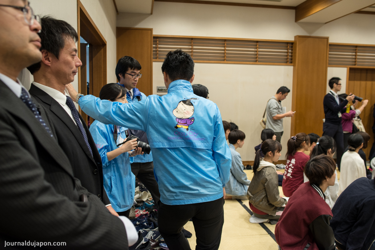- Hikaru-kun sur les blousons du personnel de la mairie d’Otsu, lors d’une compétition internationale de Karuta