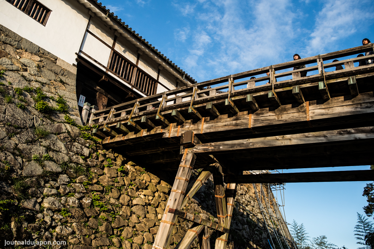 Situé en haut d’une colline au bord du lac Biwa, le château de Hikone fait partie de la poignée de châteaux japonais a avoir résisté à l’épreuve du temps. Sa construction débuta en 1603 et un certain nombre de ses éléments comme les pierres, les pièces de bois et autres… furent récupérés des châteaux environnant pour le construire. On peut observer les stigmates de ces manœuvres sur les pièces de la charpente du donjon, importées du château d’Otsu après la bataille de Sekigahara.