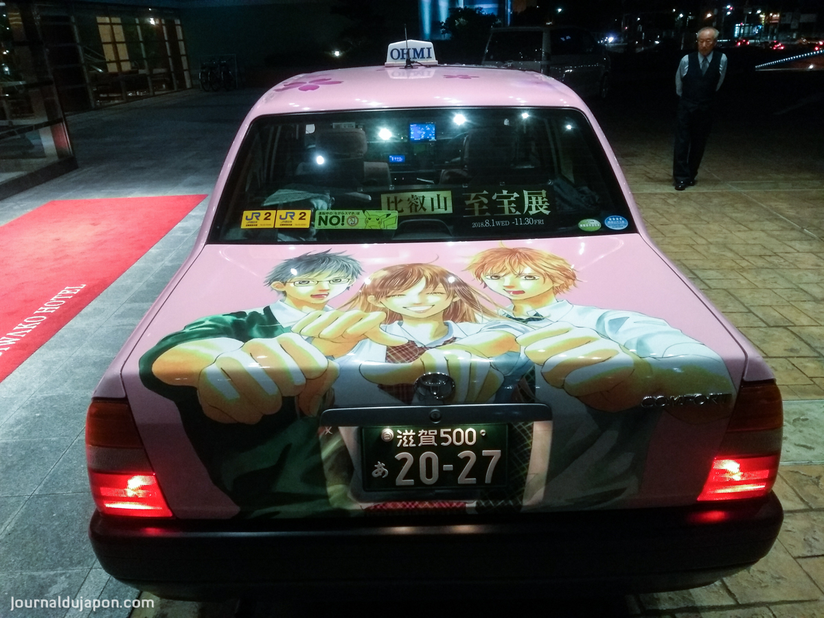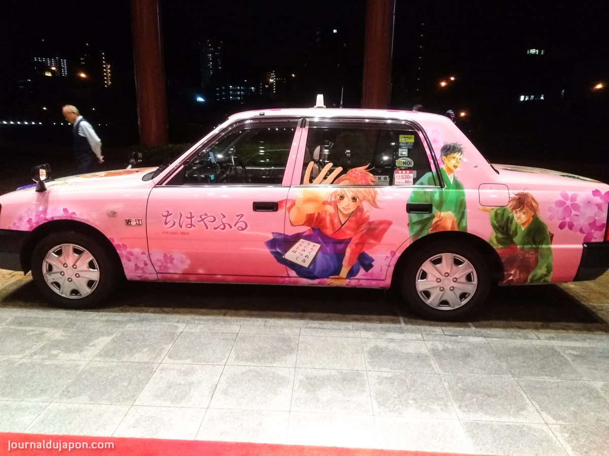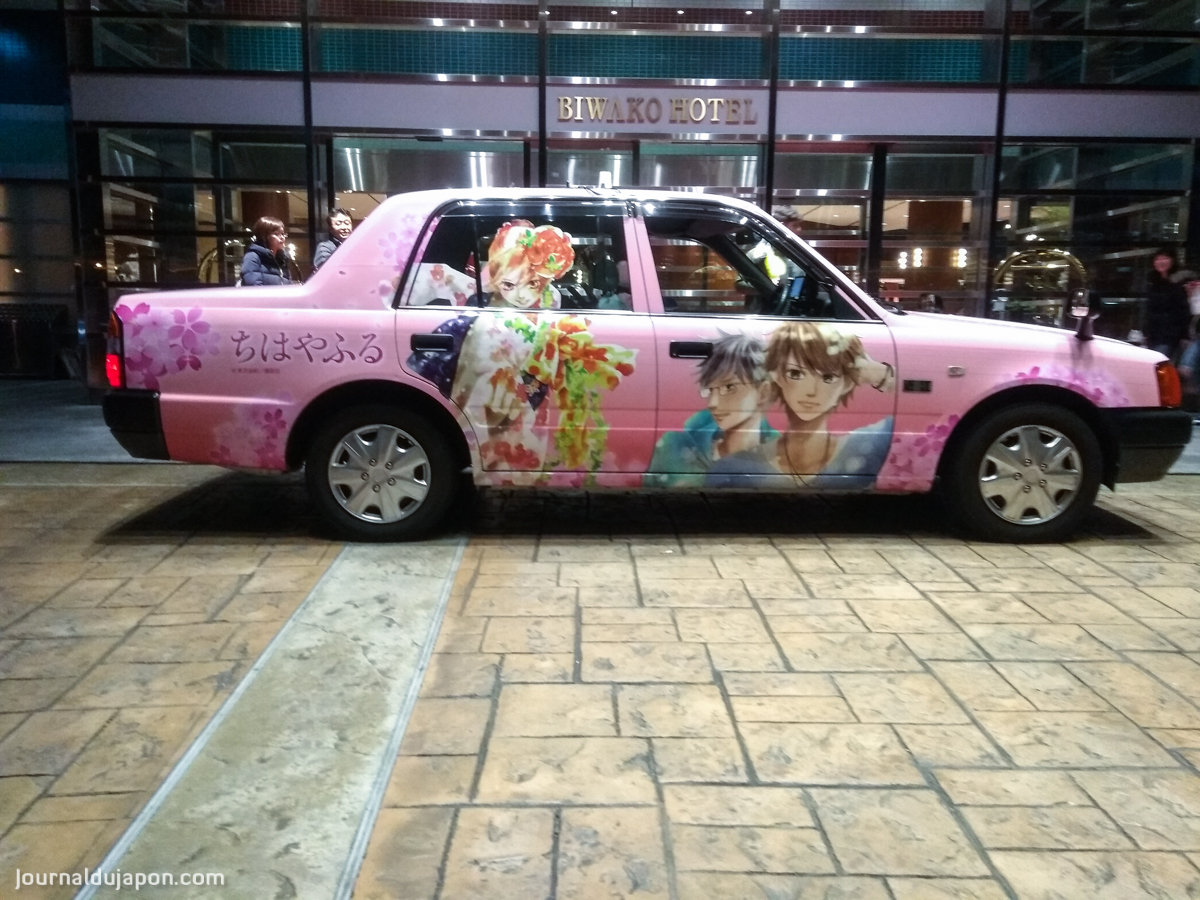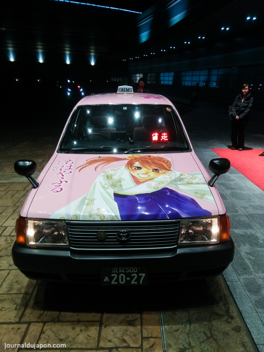 Le sanctuaire comme la ville sont ravis des nouvelles mascottes que représentent les personnages du manga. On les retrouve ainsi dans l’enceinte du sanctuaire ou du centre de karuta (où leurs effigies sont accompagnés de dessins et dédicaces originales de Yuki SUETSUGU mais aussi de l’équipe du film). La Mairesse d’Otsu nous a d’ailleurs expliqué que des partenariats avaient été mis en place avec la ville : les personnages de Chihayafuru sont mis en scène dans des brochures touristiques et on les retrouve même sur la carrosserie d’un des nombreux taxis qui sillonnent la ville.