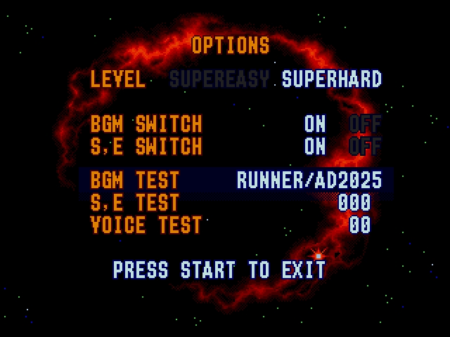 Le menu des options, où il est possible d’écouter toute la bande-son. Notez que le jeu est en « Super hard » par défaut.