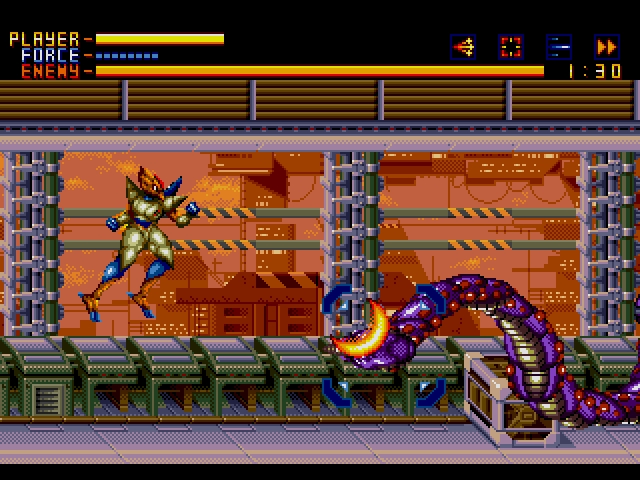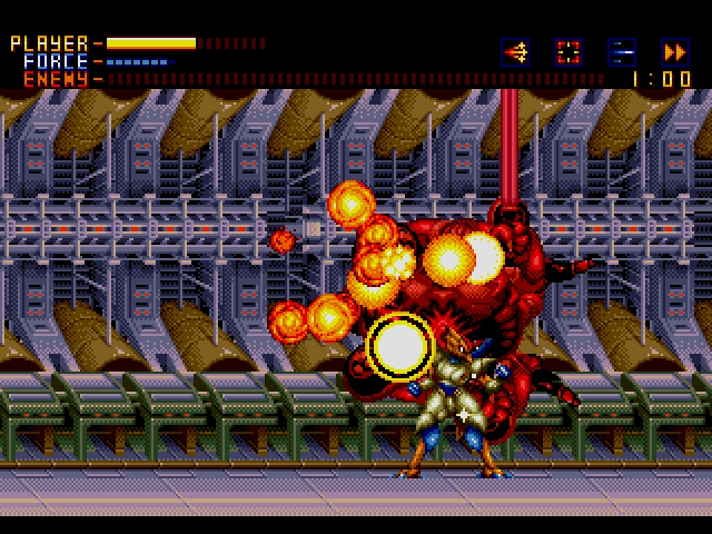 Comme dit plus haut, l’une des ambitions d’Alien Soldier est de pousser la Mega Drive à ses derniers retranchements (assez peu de chances que les joueurs de l’époque sachent réellement à quoi « X68000 » faisait référence… mais nous vous renvoyons à l’article spécial Mega Drive si besoin). En cela, il est assez réussi car non seulement il dispose de bons graphismes, avec des effets de lumière et d’explosions réussis, et son animation est fluide, peu importe le nombre de parties que peut avoir un boss. La vitesse du jeu est effectivement bonne et les dash d’Epsilon traversent l’écran à répétition et à toute vitesse. Qu’il y ait deux, trois ou dix ennemis devant soi, des projectiles et des explosions, il n’y a aucun ralentissement… à part dans les menus, par moments.
