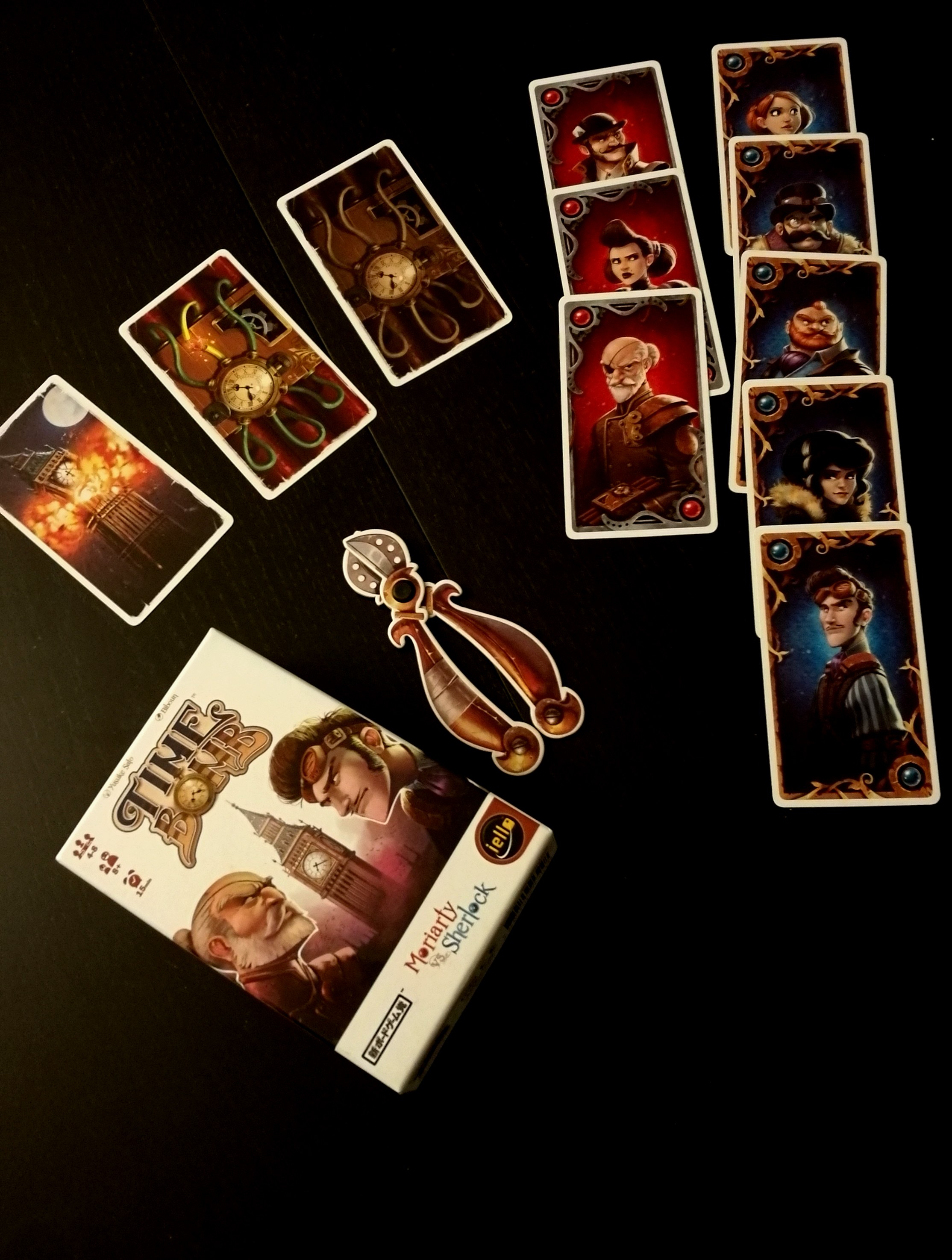 Autre jeu en format voyage mais beaucoup plus rapide. Et pour cause, le temps presse ! Le clan de Moriarty a implanté une bombe dans Big Ben et il ne reste plus beaucoup de temps à l’équipe de Sherlock pour la déloger et couper les bons fils avant qu’elle ne fasse exploser Londres. A rôle caché, chaque joueur fait partie du premier ou du deuxième clan et reçoit des cartes câbles (le nombre étant définit selon le nombre de joueurs). Le but est simple, les Sherlock doivent couper les bons câbles dans la main des autres joueurs alors que les Moriarty souhaitent gagner du temps pour voir Big Ben exploser. Et pour se faire, un joueur détient la pince pour couper les câbles chez les autres qui, selon leur désir de voir la ville sauver ou périr, ment ou dis la vérité sur le nombre de bons câbles qu’il détient dans sa main.