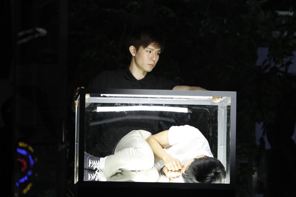 A l’origine de ce succès, il y a d’abord un choix de mise en scène original et fort. Face à l’impossibilité d’utiliser un seul décor pour toute la pièce, et à la nécessité de changer rapidement de lieu selon que l’on voit l’histoire de Kafka ou celle de Nakata, NINAGAWA a en effet inventé un ingénieux dispositif de boites translucides sur roulettes, à l’intérieur desquelles chaque lieu de la pièce est symbolisé.