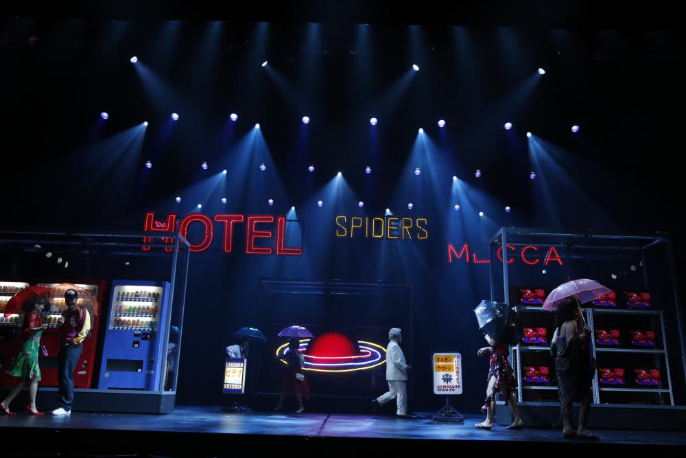 L’avantage de ce dispositif est double : bien sûr, le premier est d’ordre pratique, le passage d’une section à l’autre de l’histoire se faisant rapidement, en déplaçant quelques boites. Quant au second il est plutôt esthétique, les changements de scène prenant l’aspect d’un hypnotique et minutieux ballet d’hommes en noirs et de décors glissant sur la scène. Toujours à ce sujet, il convient aussi de noter et saluer le formidable travail de Tsukasa NAKAGOSHI, à l’origine de la scénographie et qui a réuni, pour la pièce, les plus somptueux décors. Chaque boîte, en effet, est un trésor d’invention, au symbolisme éloquent. Un banc cassé pour figurer une retraite dans la montagne, quelques néons pour un hôtel, des arbres touffus pour la forêt, des rayonnages débordants de livre pour une bibliothèque, chaque décor est une œuvre d’art en soi. Surtout, chaque bloc respire la vie, donnant à la pièce un côté sensible. De l’écriture de MURAKAMI, on dit souvent qu’elle déborde de marques, et que ces dernières contribuent à ancrer ses œuvres dans un réel familier, parce que parler des Ray-ban que porte son personnage ou du paquet de Camel qu’il fume, c’est s’assurer que le monde entier puisse se le figurer. Et la minutie avec laquelle NAKAGOSHI a conçu les décors répond à la même dynamique, rendant visibles et concrets la réalité et le réalisme de la pièce, plaçant le spectateur dans un monde familier.