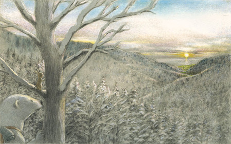 Une histoire très poétique illustrée avec les doux traits de crayon de la talentueuse Chiaki Okada. Les sapins couverts de neige, les lapereaux joueurs, une maman lapin et un ours polaire aussi doux que du coton, le tout accompagné par de magnifiques jeux d’ombres et de lumière sur la neige et les branchages de l’épaisse forêt. Un régal pour les yeux !