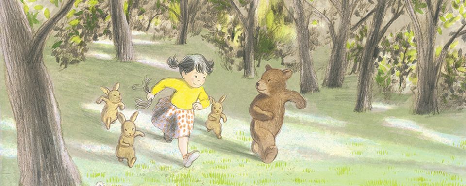 L’amitié et le partage superbement mis en scène dans cette forêt verdoyante où lapins, ours et petite fille sont amis.