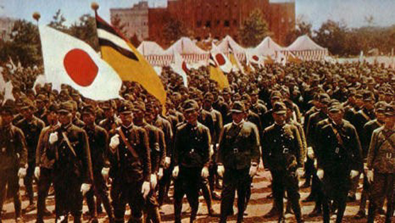 En 1931, les nationalistes se regroupent dans la Société pan-japonaise pour la lutte unifiée des patriotes (Nikkyo) qui reçoit le soutien financier de riches sympathisants et de l’armée, notamment cantonnée en Corée et le long du chemin de fer en Mandchourie. L’armée du Kwantung postée en Mandchourie prépare en secret, dans le dos de Tokyo et du pouvoir civil, une invasion de la région. Dans la soirée du 17 septembre 1931, les Japonais font exploser une section de voie ferrée appartenant à la société japonaise des chemins de fer de Mandchourie du Sud près de Moukden. Accusant « des bandits chinois », l’armée japonaise riposte et envahit la Mandchourie et sa capitale, Moukden. La Société des Nations ne reconnaît pas l’état créé par le Japon, le Mandchououo où a été placé en 1932 par Tokyo Puyi, le dernier empereur chinois d’origine mandchoue.