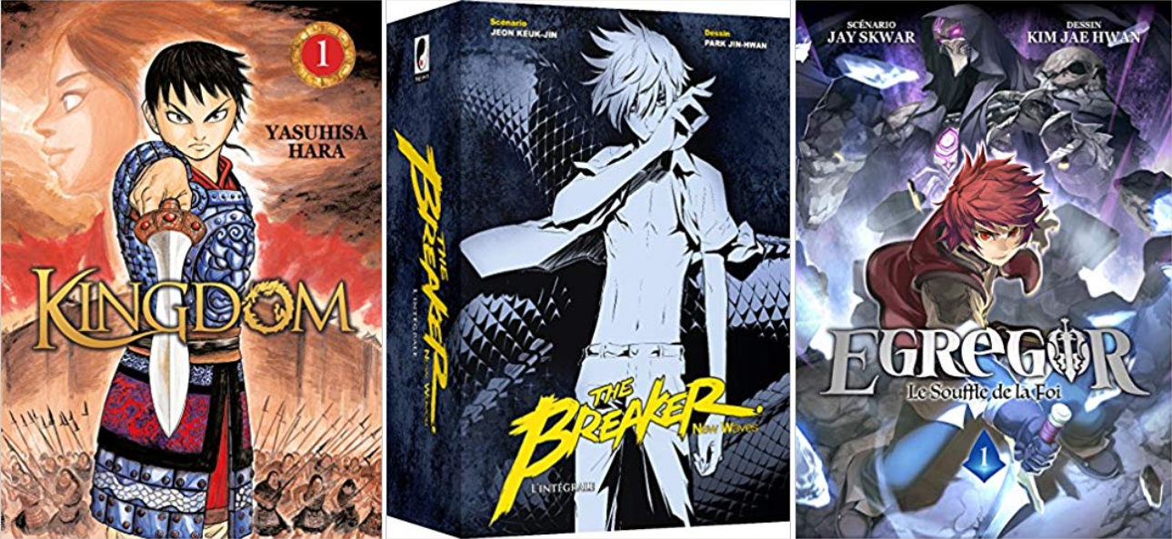 Du côté de Meian, on frappe fort aussi avec l’arrivé de Kingdom. Le petit éditeur rattrape rapidement son retard sur ce manga encensé par la critique et publie les dix premiers tomes en 2018. La guerre dure depuis cinq siècles en Chine, et Shin, un garçon compte bien tirer son épingle du jeu à l’aide de son épée. The Breaker : New Wave, la suite de The Breaker, est un manhwa a succès compilé en deux fois dix tomes l’année dernière. Et enfin, un manfra, avec Egregor, l’histoire d’un jeune forgeron qui se voit contraint de prendre les armes quand son village est menacé par les Faucheurs, des monstres qui organisent des « moissons » un peu partout.