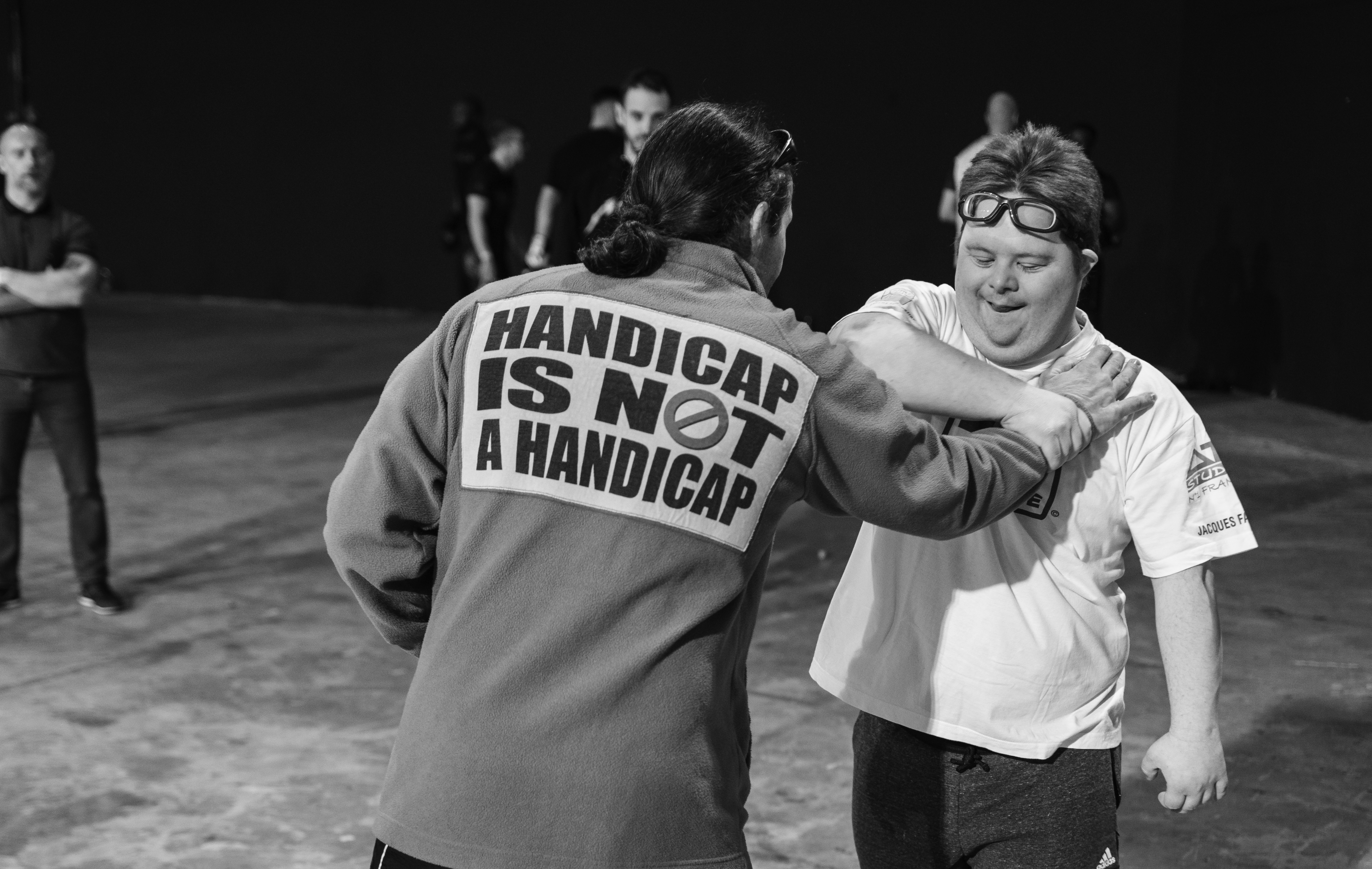 Là où ça se développe plutôt bien c’est en Espagne. Il y a un énorme groupe qui est en train de se créer et avec lequel ils font un magnifique travail, en réalisant notamment comme nous des stages d’enseignements. Il y a des handicaps pour lesquels ils n’ont pas encore l’accès car c’est un peu plus compliqué, notamment la tétraplégie, car c’est très complexe, comme c’est neurologique. Il faut un peu de base en médecine. Il ne faut pas être que pratiquant car là on entre dans des contextes de crispations, où il peut y avoir des embolies, des crises d’asthme, et mille autres choses. Il y a des risques d’aggravations, et on peut courir à la catastrophe. C’est un volet qui n’existe qu’en Suisse pour l’instant. Il est encore à titre intime et très expérimental. J’ai 17 jeunes qui bénéficient de ce programme, mais pour le moment je suis le seul à m’occuper d’eux. Ce n’est pas simple car je n’ai pas toujours le temps. Ces personnes bénéficient de tous les équipements d’arts martiaux gratuitement, elles ne paient rien. On offre tout, on a des partenaires qui payent à l’année pour qu’on puisse s’occuper d’eux.
