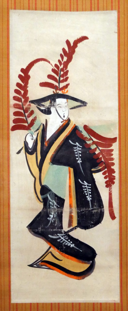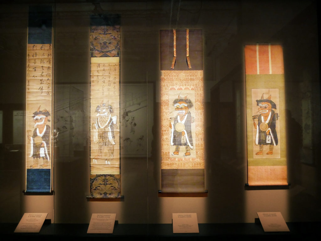 L’image du démon à l’apparence de moine est la figure la plus emblématique des Ôtsu-e. C’est elle qui sert d’ailleurs de devanture pour les marchands d’images, et une partie entière de l’exposition lui est même consacrée. Couramment appelée oni no nenbutsu, cette peinture représente une créature monstrueuse venue des enfers bouddhiques et habillée avec les vêtements et les accessoires d’un moine. Oni désigne en fait le démon alors que le nenbutsu est une prière dédiée au bouddha Amida dont nous parlions précédemment et qui devait être répétée avant la mort pour s’assurer une place auprès de ce dernier.