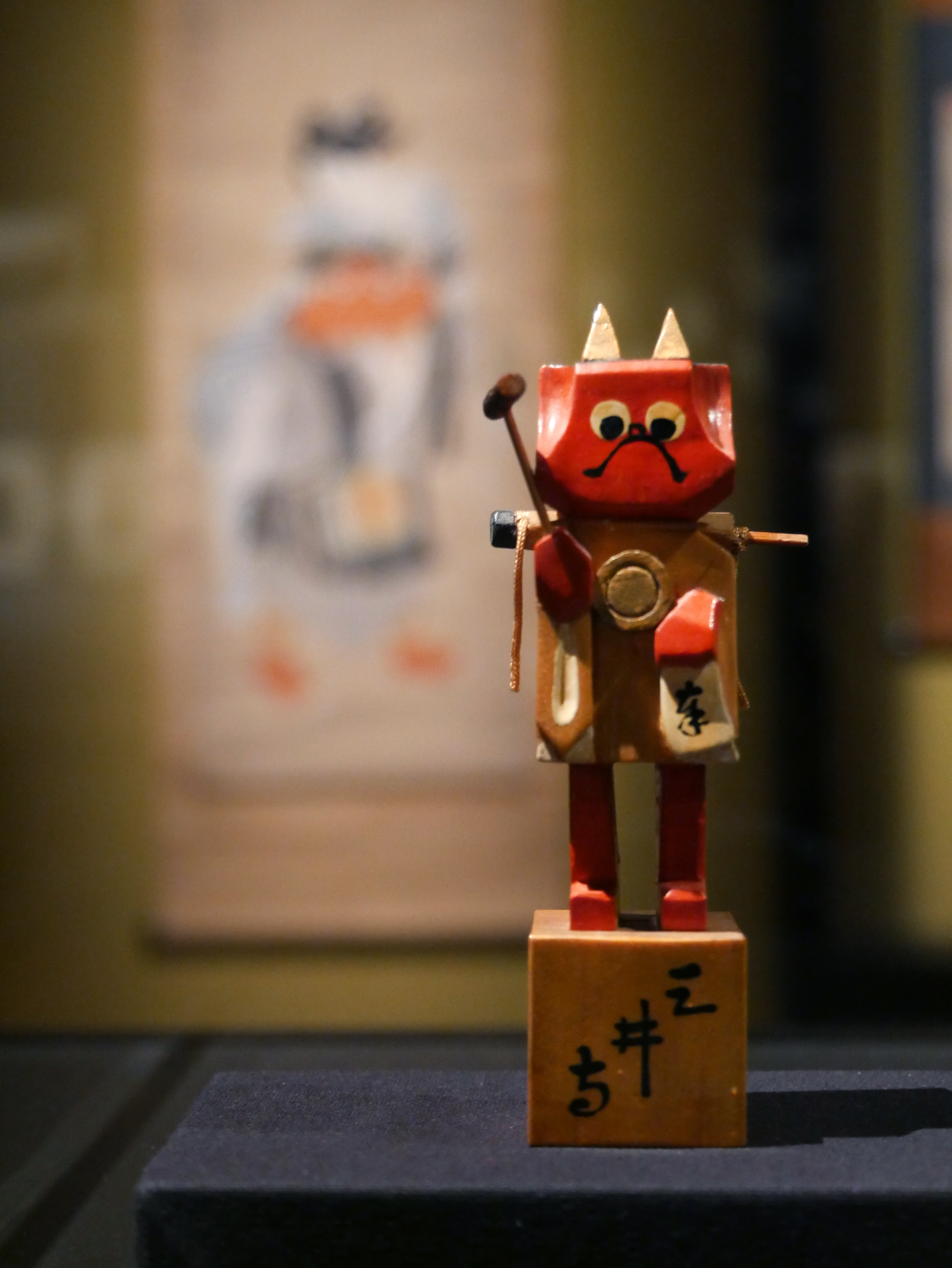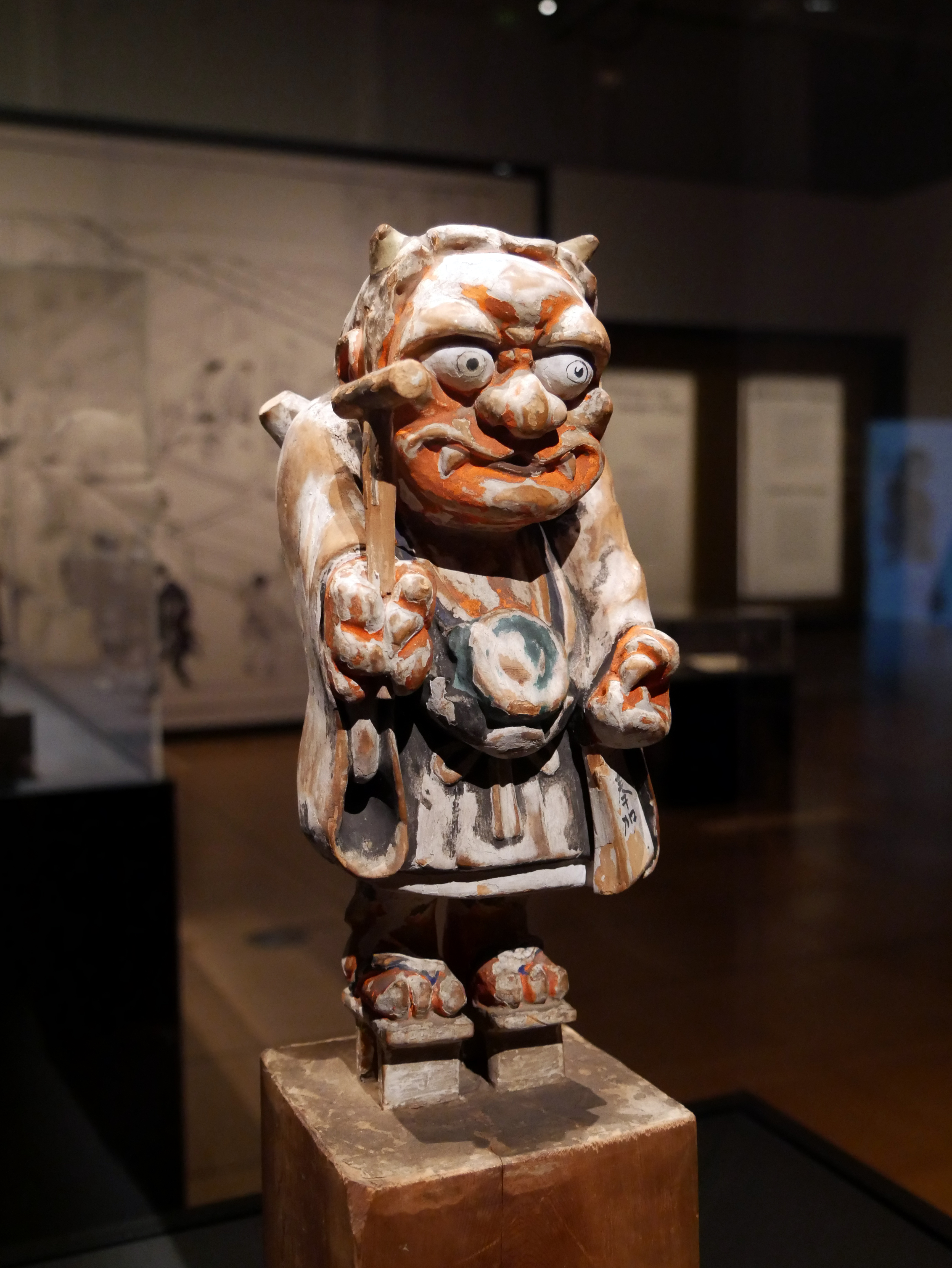 L’image du démon à l’apparence de moine est la figure la plus emblématique des Ôtsu-e. C’est elle qui sert d’ailleurs de devanture pour les marchands d’images, et une partie entière de l’exposition lui est même consacrée. Couramment appelée oni no nenbutsu, cette peinture représente une créature monstrueuse venue des enfers bouddhiques et habillée avec les vêtements et les accessoires d’un moine. Oni désigne en fait le démon alors que le nenbutsu est une prière dédiée au bouddha Amida dont nous parlions précédemment et qui devait être répétée avant la mort pour s’assurer une place auprès de ce dernier.