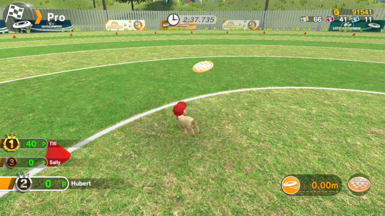Un bon moyen de se faire des piécettes sont les tournois de disques pour chien. Rien de nouveaux jusque là puisque cette fonctionnalité était déjà disponible dans Nintendogs ainsi que dans Nintendogs + Cats.Trois minutes pour marquer le plus de points en jetant un disque que votre chien doit récupérer avant qu’il touche le sol. Encore une fois, soit il vous faudra appuyer sur un simple bouton pour jeter votre disque si vous attachez les Joy-con à la console, soit il vous faudra, à la façon de la Wiimote, simuler un jet de disque avec les Joy-Con détachés. Il y a cinq niveaux de difficulté que vous débloquez au fur et à mesure que vous remportez les tournois : débutant, intermédiaire, pro, semi-pro et maître. Les récompenses sont bien entendu croissantes allant de 3000 piécettes et 5 tickets à 9000 piécettes et 50 tickets. Vous devrez entraîner votre chien hors compétition pour espérer le faire progresser et atteindre la ligue Maître. Pour se faire, vous débloquez des disques de différentes portées dans la boutique, court, moyen, long. Pas de compétitions disponibles pour nos amis félidés malheureusement.