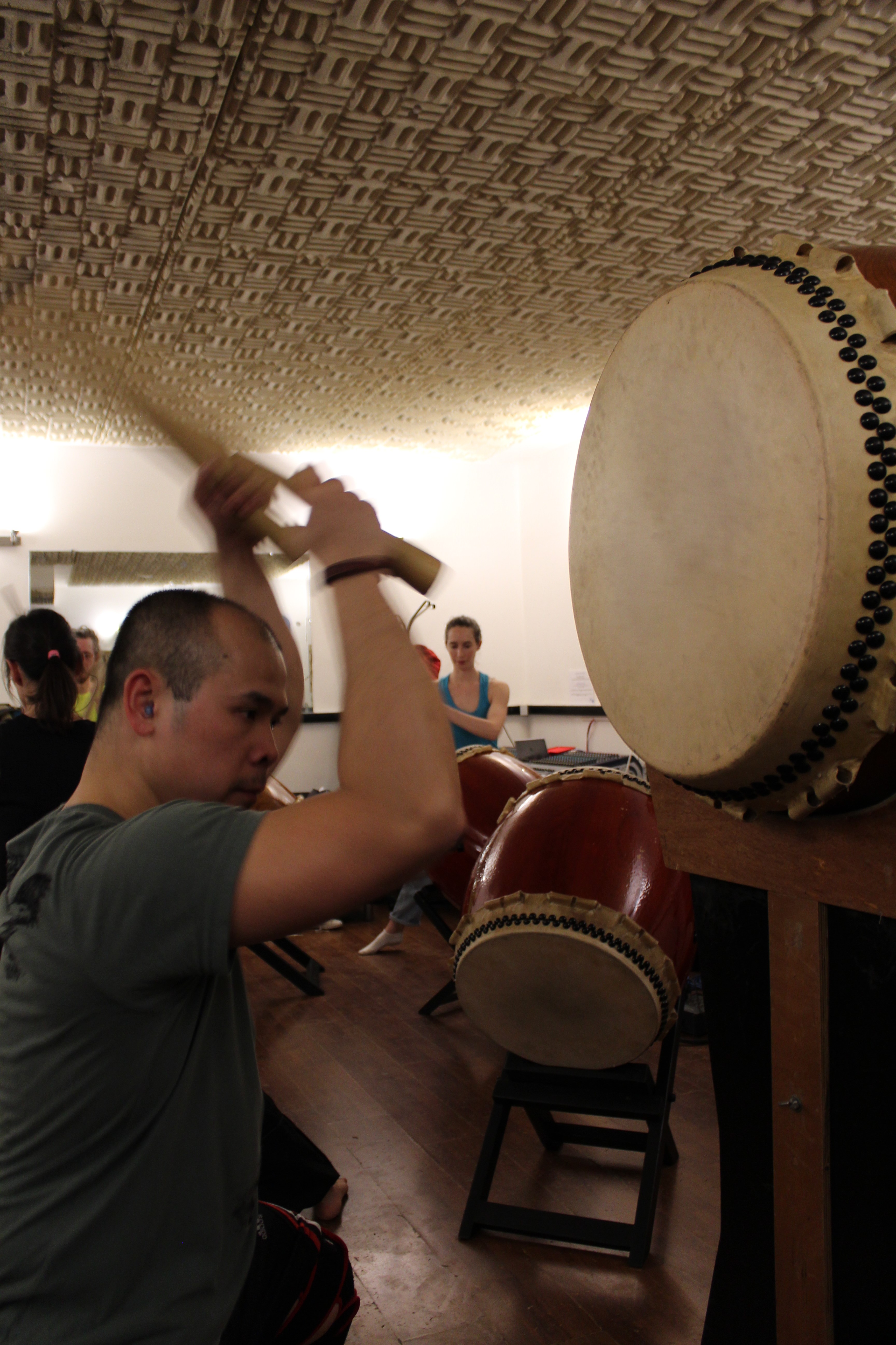Oui bien sûr tout le monde peut le pratiquer. La difficulté majeure réside dans les éventuels problèmes physiques, comme un problème à l’épaule par exemple, dans ce cas il faut juste s’adapter. Je ne demande pas la frappe parfaite, tout le monde fait ce qu’il peut et évolue dans le temps même si je suis parfois exigeant durant mes cours. Il n’y a aucune limite d’âge. Cette année, par exemple, nous sommes une trentaine de personnes à Paris Taiko Ensemble. Il y a deux cours débutants, le jeudi ou vendredi, avec un autre cours confirmé et le samedi matin. Les débutants qui commencent en milieu d’année je leur donne des cours particuliers pour qu’ils rattrapent les autres qui ont commencé l’année tôt pour travailler en groupe. Il y a quand même un groupe principal, mais j’y incorpore dès que possible des débutants qui évoluent bien, et présentent bien sur scène. J’ai une débutante par exemple, qui développe son propre style car elle fait elle-même des arts martiaux. Elle a ainsi une très bonne mémoire, je travaille en conséquence avec elle. Je les mets face au défi d’une prestation sur scène en les préparant en amont, car j’estime qu’ils peuvent le faire et possèdent leur propre style.