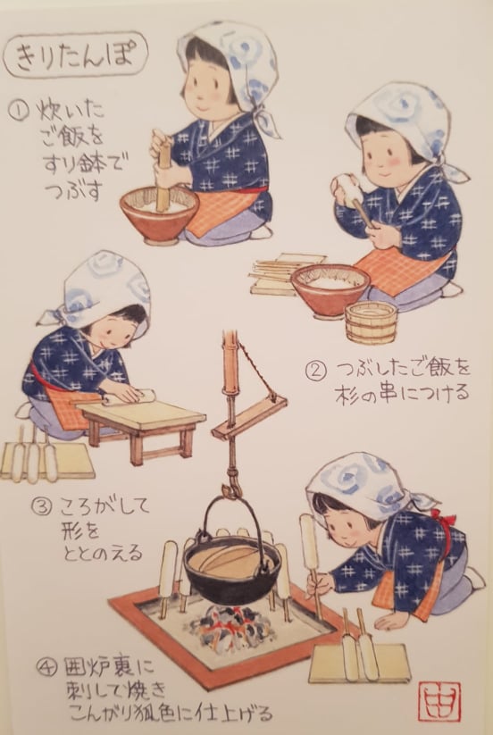 Le kiritanpo nabe est une sorte de pot-au-feu nippon, dans lequel des cylindres de riz pilé, écrasé et enroulé autour d’un bâtonnet en bois de cèdre japonais (les kiritanpo) sont plongés dans un bouillon garni de différents ingrédients : poulets, bardane, oignons longs, champignons, persil… Traditionnellement, les kiritanpo sont grillés autour d’un feu. On dispose alors les bâtonnets, plantés dans le sol, en cercle autour de ce feu et on patiente le temps que le riz prenne une jolie couleur dorée.