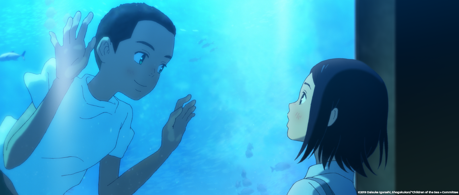 En effet, durant la première partie du film, le spectateur évolue en terrain connu. On nous présente Ruka, privée de handball, évoluant dans une famille dysfonctionnelle avec un père absent et une mère au bord de l’alcoolisme : on comprend rapidement ses désirs d’évasion. Ceux-ci seront comblés grâce au monde marin, qui reste le point central de l’œuvre originale comme de l’adaptation. En effet, Ruka a toujours admiré les créatures marines, et c’est donc lors d’une de ses escapades à l’aquarium qu’elle fait la connaissance d’Umi, puis plus tard de son frère Sora, deux « enfants de la mer », élevés par des Dugongs. De là on voit se dérouler un slice of life classique mais attendrissant entre les trois enfants, dépeignant les premières amitiés et peut être même les premiers amours, à la libre interprétation du spectateur.