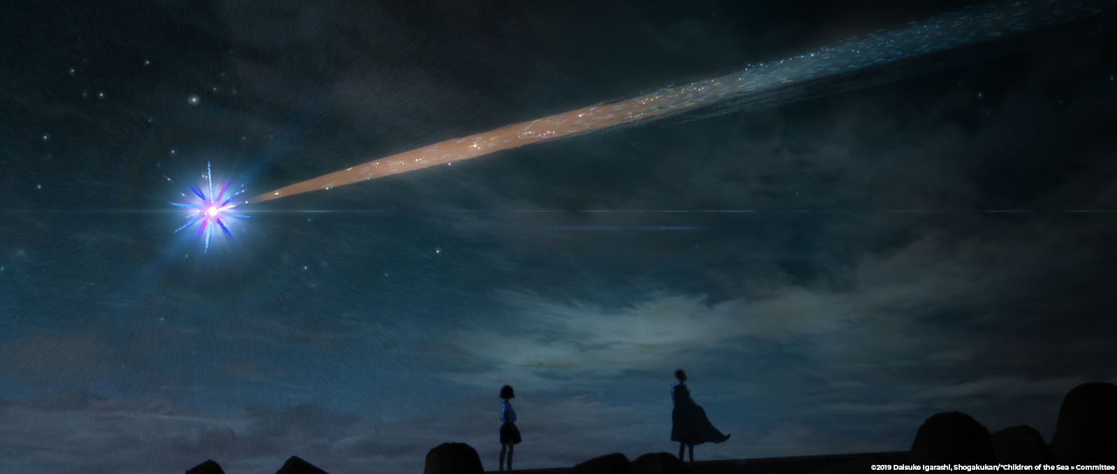 On apprécie d’autant plus ces scènes de ballet aquatique qu’elles sont accompagnées par la musique de Joe HISAISHI. Ce compositeur particulièrement connu pour avoir réalisé les bandes originales d’une grande partie des films du studio Ghibli (Princesse Mononoke, Le voyage de Chihiro,…). La musique de ce mythique compositeur convient parfaitement à l’ambiance des « Enfants de la mer » qui par ses allures d’ode à la nature rappelle les films de MIYAZAKI. Le réalisateur des Enfants de la mer confie d’ailleurs qu’il est un grand fan du compositeur, depuis très longtemps, et qu’il s’était toujours dit que le jour où il réaliserait son propre film, il faudrait absolument que ce soit lui le compositeur !