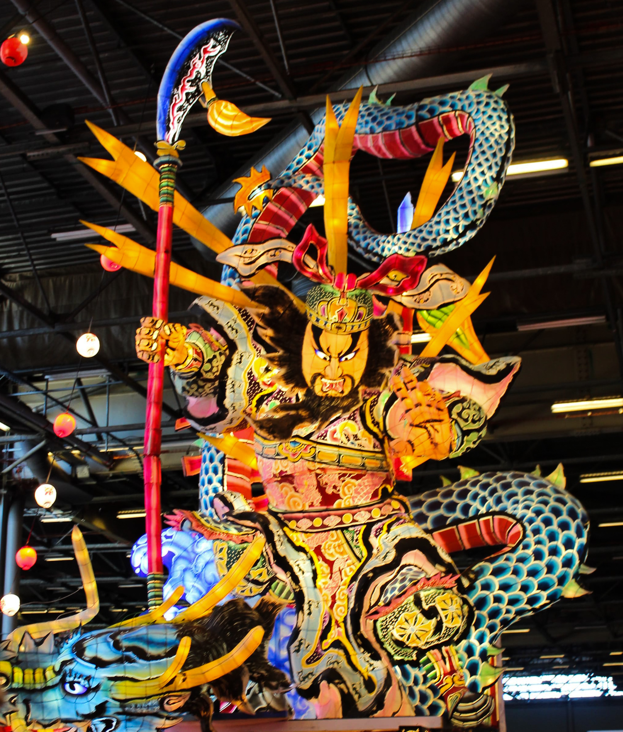 Ce qui est sûr, c’est qu’ils n’ont pas lésiné sur les moyens côté décoration : entourée de guirlandes rougeoyantes, une immense lanterne représentant un dieu accompagné d’un dragon régnait au milieu de l’espace rappelant les célèbres chars Nebuta du Aomori Nebuta Matsuri… Un vrai décor de matsuri ! Les yeux de l’ensemble des visiteurs se sont émerveillés devant ce titan de lumière. Un concurrent sérieux au ballon Naruto traditionnel du stand Kana !