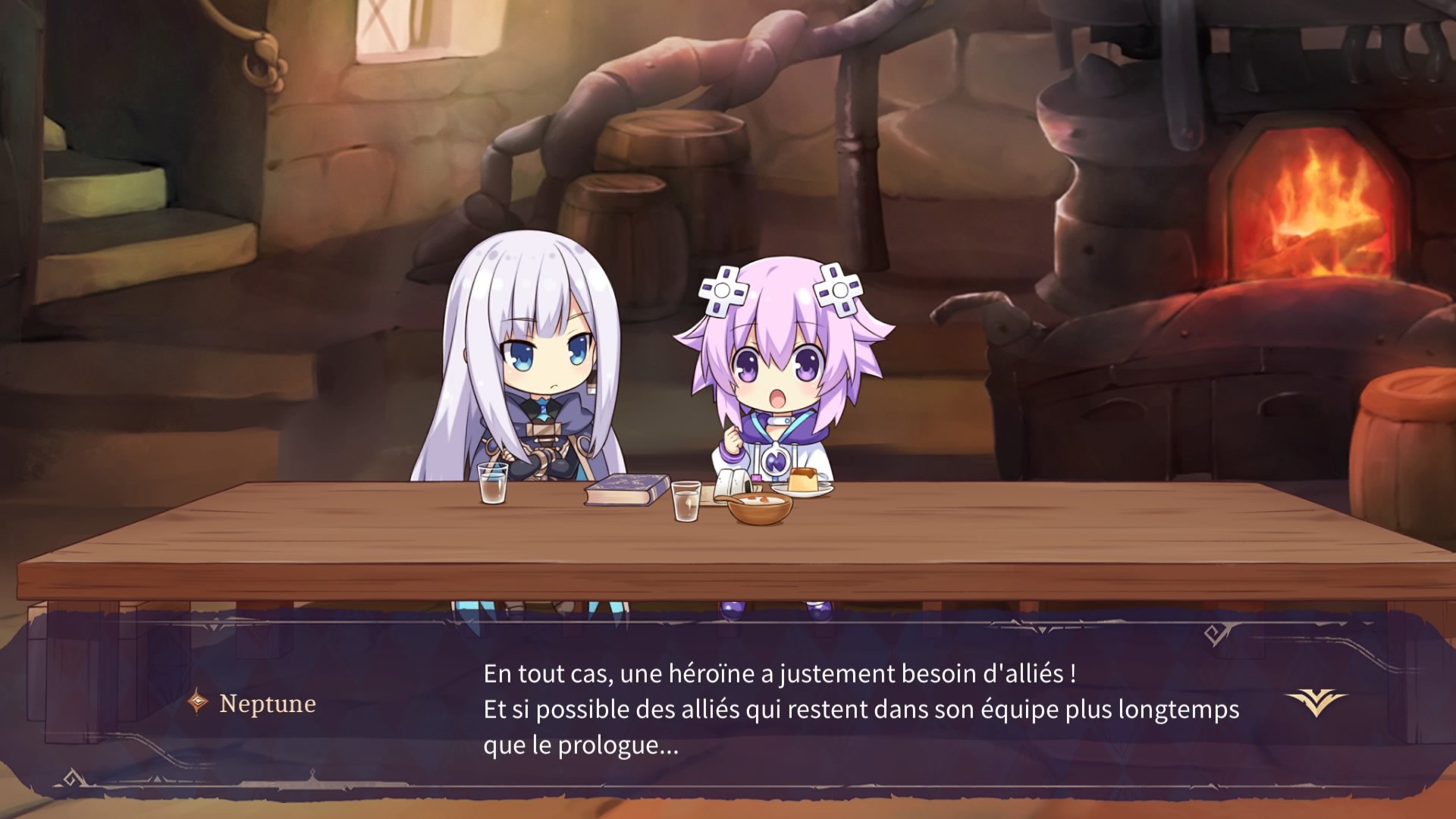 Elle finit par disparaître, ainsi que les trois amies de Purple Heart. Elle aussi finit par disparaître… et c’est Neptune qui prend le relais, se réveillant dans un lit dans la ville de Lastation. Un homme en uniforme noir vient la voir et lui demande de payer ses impôts… quels impôts ? Neptune ne se souvient de rien. Ni même de qui elle est, si ce n’est qu’elle sait comment elle s’appelle… et comme son prénom est dans le nom du jeu, elle sait que c’est elle, l’héroïne ! L’homme se présente comme étant un contrôleur des impôts des Bombyx Mori, une organisation qui règne un peu partout… Neptune, quant à elle, se décide à aller faire quelques missions et explorer un peu ces lieux qui lui sont inconnus. De fil en aiguille, elle va vite trouver d’autres filles qui sont dans le même cas qu’elle et ensemble, elles vont vivre diverses aventures, pour retrouver la mémoire, pour lutter contre les méchants de service qui en ont après elles, et… pour trouver du flan… ? Neptune, sois gentille et ne fais pas écrire n’importe quoi au rédacteur de ce test, s’il te plait ! /(>w<)\