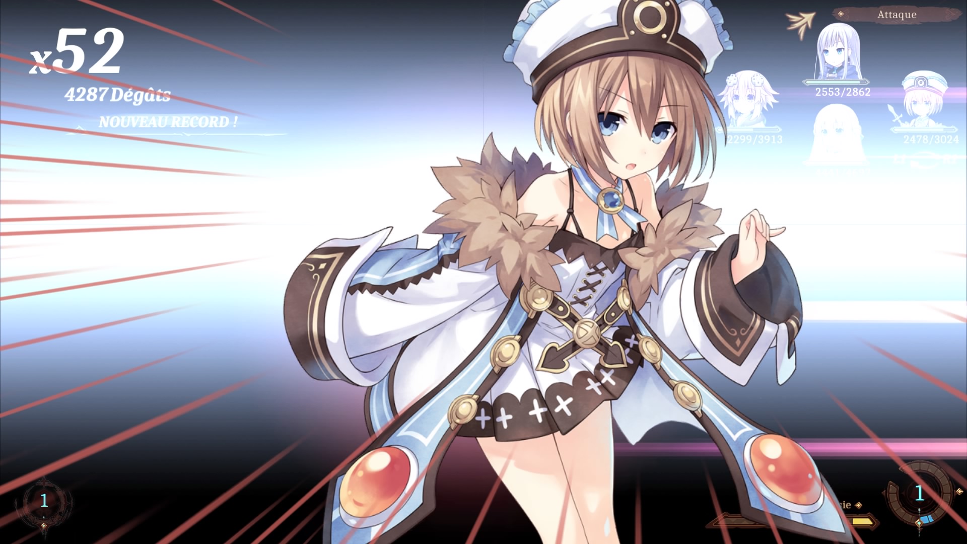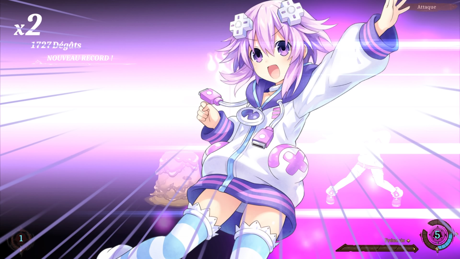 La première chose que l’on remarque en engageant un combat, c’est que le système habituel abandonne le tour par tour pour passer en temps réel. Les personnages et ennemis disposent tous d’une jauge d’action qui se remplit au fil du temps, et chaque action hors objets coûte un certain nombre de points dans cette jauge, qui est d’ailleurs commune à tous les personnages d’un même camp. Elle peut aller jusqu’à douze niveaux, et les actions des personnages coûtent toutes un nombre différent de niveaux. Chaque personnage est assigné à une touche (croix, carré, rond et triangle), et il faut donc faire attention à utiliser ses points sagement. On peut ainsi parfois s’amuser à créer un gros bazar en faisant attaquer tout le monde en même temps si on le veut… ou les faire agir tous les uns après les autres… en fait, ce système ressemble à celui d’un Valkyrie Profile, et on ne peut pas dire que ce soit une mauvaise chose. D’autant plus qu’au contraire de ce qu’on peut croire dans les premiers instants, ce n’est pas un simple « pompage ». Super Neptunia RPG ajoute ses propres mécaniques à la fête…