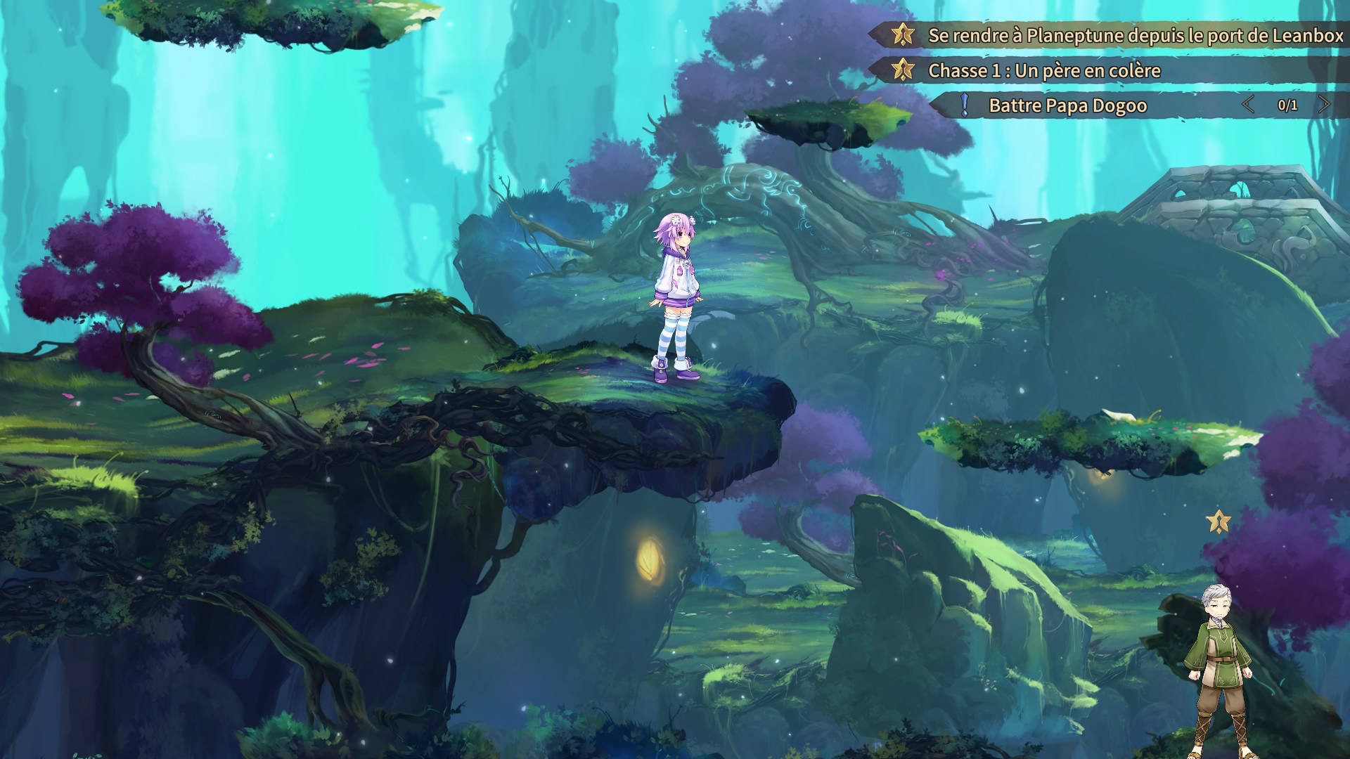 Nep (permettez le diminutif) est capable de sauter et faire un dash, ce qui lui permet d’atteindre des plates-formes parfois inaccessibles autrement. C’est quelque chose que l’on remarque assez vite dans le jeu : il y a une partie plate-forme assez légère qui évite de se balader dans des décors toujours « tout plats », au profit d’une exploration plus présente et intéressante que des simples allers-retours entre ville/donjon/boutiques/donjon/etc. Etant donné que les monstres sont visibles dans les champs d’exploration ou donjons, on peut les esquiver facilement en sautant par-dessus si jamais on veut éviter les combats (attention à ne pas tomber dans un trou, il y en a quelques-uns…). Nep peut aussi mettre un coup de sabre. Ceux-ci ont pour but d’activer quelques mécanismes de temps à autre et aussi de toucher les monstres en premier. On obtient ainsi un bonus au lancement du combat, chose caractéristique de la série.