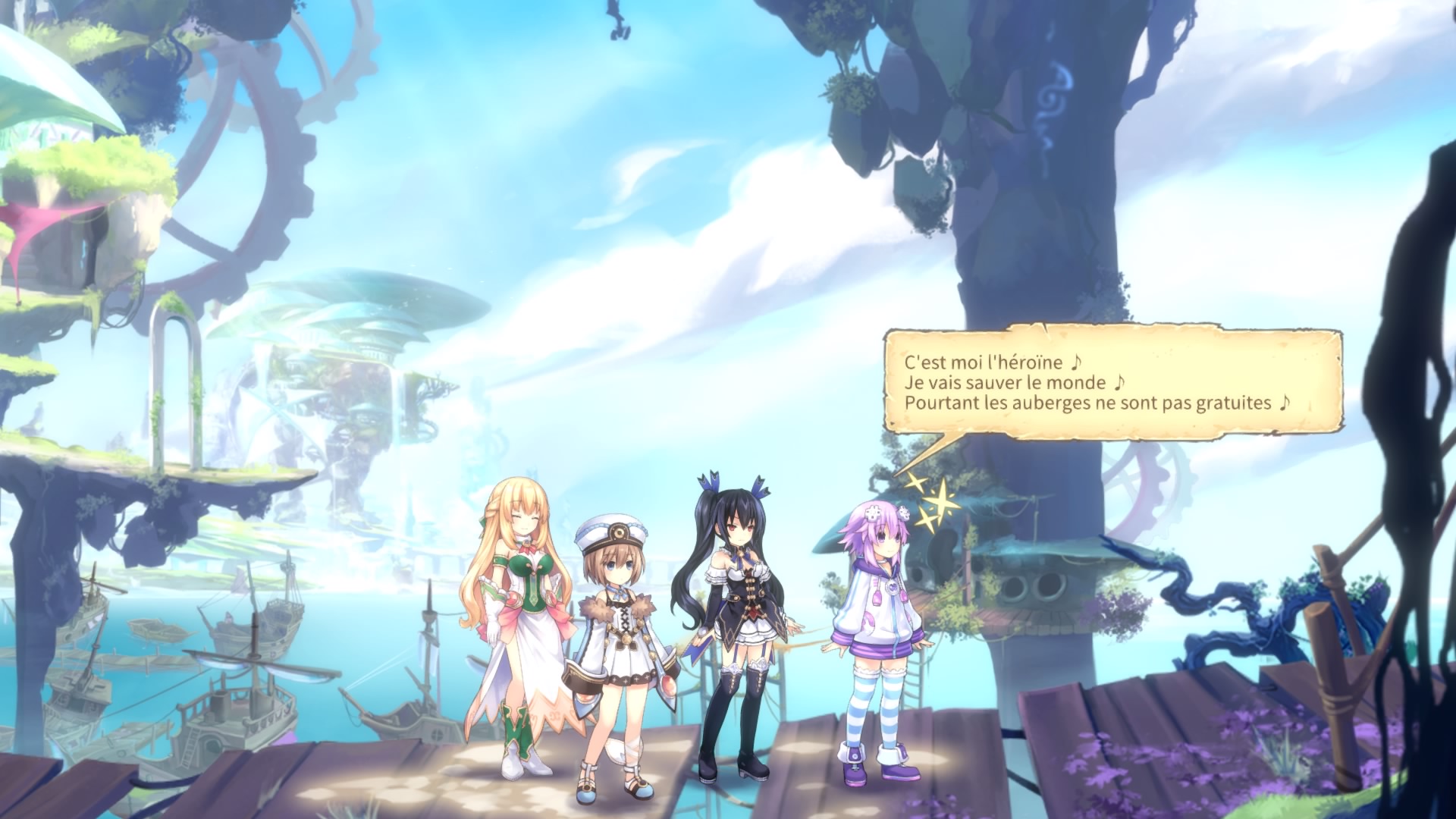 L’animation est elle aussi de bonne qualité. C’est fluide, rapide, ça réagit très bien. Les mouvements des personnages sont détaillés et nombreux, il est aisé et plaisant d’enchaîner les différents mouvements de plate-forme aussi. Course, saut, dash, aucun répit n’est demandé. Il y a bien ce petit temps de latence dans les sauts (mais ce n’est pas le premier Neptunia à en avoir, c’est à se demander si ça n’a pas été fait exprès pour coller à l’ambiance cette fois-ci…).En revanche, les menus semblent parfois un peu raides et là où le jeu est moins « attirant », c’est plutôt dans ses chargements. Ils sont généralement assez rapides, mais certains (comme le tout premier lors du lancement du jeu à chaque fois qu’on charge une sauvegarde) durent plus de trente secondes. Pourquoi ? Les chargements entre écrans et zones sont pourtant assez rapides, voire presque immédiats, tout comme les sauvegardes qui ne durent que le temps d’un clignement d’yeux… de plus, on regrettera qu’au lieu de se retourner proprement, les personnages subissent plutôt un retournement de sprite tout simple lors des discussions. Là encore, c’est un détail, mais devant un si bel aspect graphique, c’est un peu dommage.