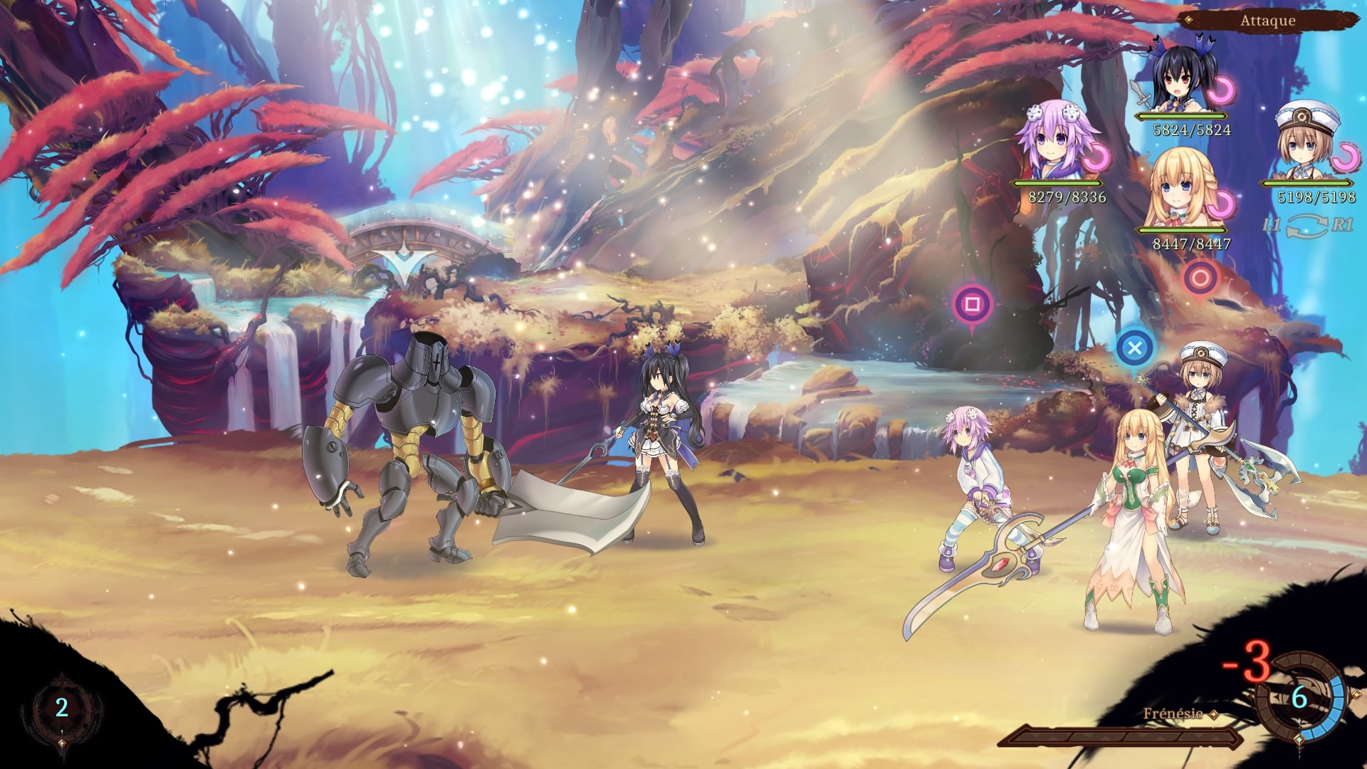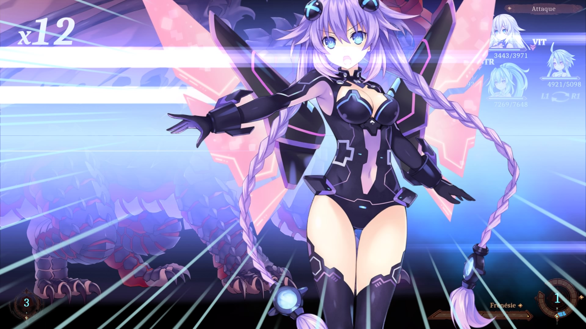 sélectionner Noire comme leader (L1 ou R1 pour cela) puis appuyer sur « bas » jusqu’à trouver la formation où Neptune est en tête, et donc où Noire est sous la touche triangle (car elle est sous la touche triangle en formation Neptune), puis lui choisir son action pour la formation Neptune. Compliqué à comprendre ? Oui, c’est un système troublant et quand il faut faire cela avec quatre personnages, il faut s’accrocher pour tout comprendre et ne pas faire n’importe quoi. Pour le coup, il aurait sans doute été mieux de faire un système plus « classique » mais simple, celui-ci étant plutôt contre-intuitif, au vu de tout ce qu’on peut trouver dans le jeu vidéo depuis des années.