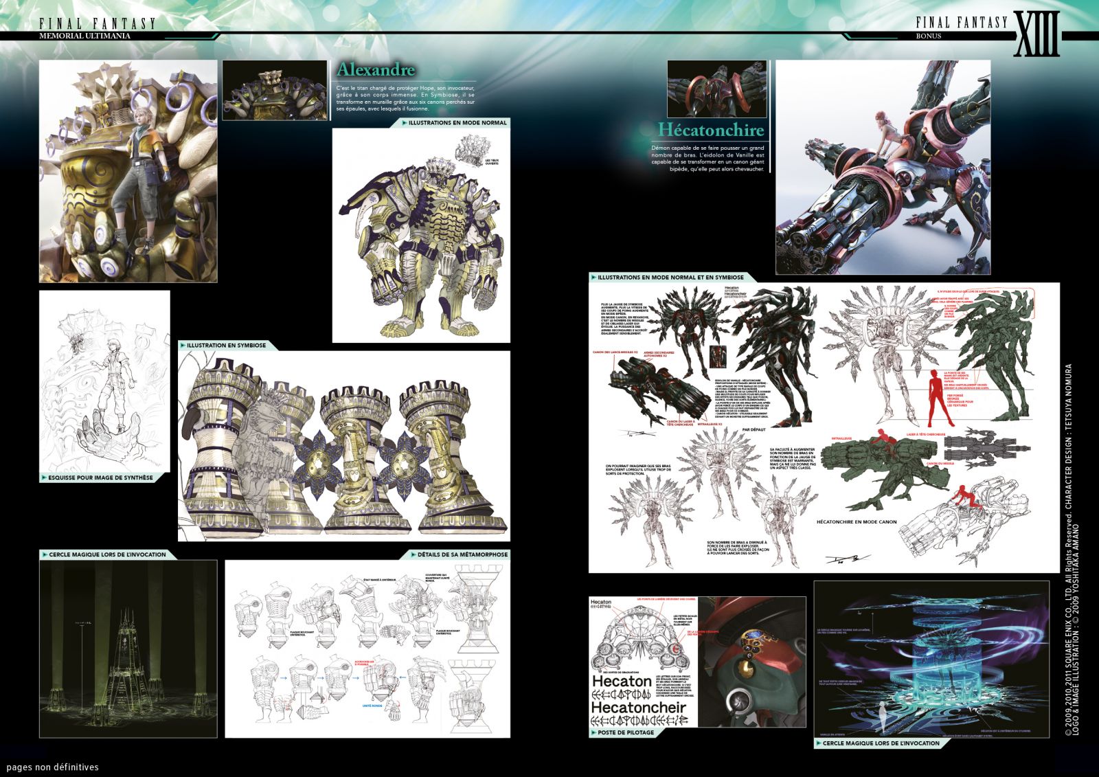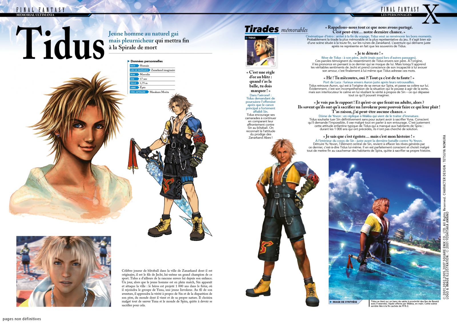 Niveau contenu, les Memorial Ultimania étant chacun consacrés à plusieurs épisodes de la saga avec dans une optique « anniversaire », on ne peut pas s’attendre à autant d’exhaustivité que dans un Ultimania « dédié ». Ici, le contenu se concentrera donc sur les épisodes principaux uniquement et seulement sur les jeux. Exit donc les suites ou spins off de chaque épisode (X-2, Lightning Returns, Revenant Wings…), de même que les produits dérivés, le marketing, etc, qu’on pouvait trouver par exemple dans l’Ultimania de FFVII. Grâce au sommaire inclut dans l’extrait proposé par Mana Books, vous constaterez également que tous les épisodes ne sont pas logés à la même enseigne. Les épisodes X, XII et XIII se taillent ainsi la part du lion, tandis que les deux épisodes MMO sont traités beaucoup plus rapidement, voire partiellement. L’épisode XIV en particulier ne couvre qu’une petite dizaine de pages, ce qui s’explique par la date de sortie japonaise du livre, qui remonte donc à 2012. Une fois cette petite mise au point prise en considération, il ne reste que du bonheur puisque ce Memorial Ultimania regroupe pour ainsi dire trois types de livres en un.