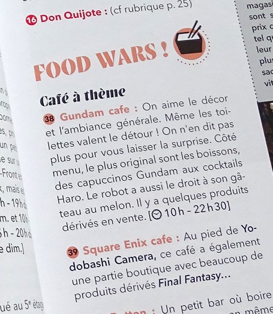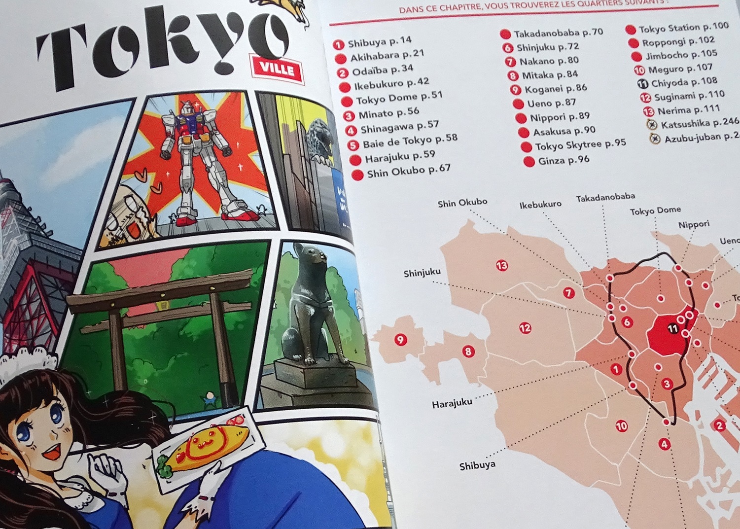 Ultra complet, voici un guide qui propose, en plus des restaurants à thèmes, toutes les activités à faire ou à voir dans chaque quartier.Comme un guide classique l’auteure répertorie les lieux où dépenser ses yens (mangas, jeux vidéos, rétro-gaming ou encore anime), mais aussi les petites adresses insolites des salles d’arcades, des salles de jeux virtuelles, les musées complètement loufoques en passant par un circuit de Mario Kart dans la ville, tout est réunis pour contenter les plus grands fan de la culture pop japonaise.