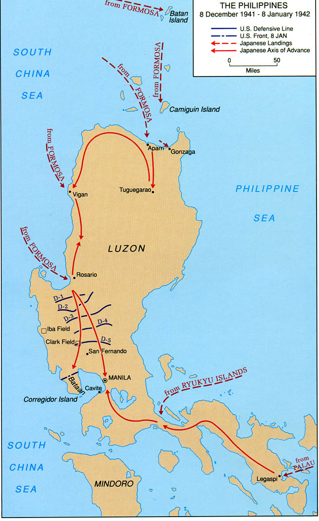 La prise des Philippines représente pour les Japonais un enjeu crucial. Du fait de sa position géographique, l’archipel peut servir d’appui pour conquérir les Indes orientales néerlandaises. Les Philippines comptent aussi de nombreux puits de pétrole, ressource stratégique vitale pour poursuivre la guerre. A cela s’ajoute le fait qu’en contrôlant l’archipel, le Japon se prémunit d’attaques venant du sud-est asiatique sur son sol. Le 8 décembre, les pilotes japonais attaquent par surprise la base aérienne de Clark Field : la plupart des bombardiers B/17 et des chasseurs Curtiss P-40 Warhawk américains sont détruits au sol sans avoir eu le temps de décoller. L’aérodrome d’Iba au nord-ouest de Luçon est aussi bombardé par les airs. Avec ces 2 attaques aériennes, la Far East Air Force vient de perdre en une seule journée plus de la moitié de ses avions. Les Japonais savent que la résistance de leur adversaire sera dorénavant faible : ils estiment alors que les Philippines, privées de couverture aérienne, seront conquises en 3 mois, Luçon, le nord de l’archipel, en 50 jours.