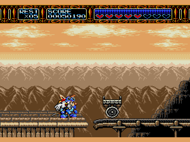 Rocket Knight Adventures met le joueur dans la fourrure de Sparkster, un petit opossum qui fait partie de l’armée d’Elhorn – un Rocket Knight. Le royaume voisin, l’empire de Devotingdos, devient menaçant car il convoite la Pig Star, un vaisseau surpuissant capable de détruire le monde ! Et de surcroit, le renégat Axle Gear trahit les Rocket Knights et capture la princesse. Tout ceci dit, le scénario du jeu est bien plus poussé, racontant l’enfance de Sparkster entre autres… mais ce que vous venez de lire est ce qu’il convient de garder en tête. Le royaume est en danger, sa princesse est en danger, c’est au héros de tout arranger !