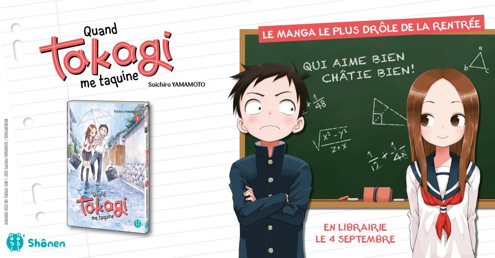 Nous vous en parlions à l’occasion de nos attentes manga de septembre, voici l’une des grandes nouveautés de l’année chez nobi-nobi ! dans leur collection shônen. Parue en 2013 dans le Monthly Shônen Sunday (Gessan) de Shôgakukan sous le nom de Karakai jōzu no Takagi-san (からかい上手の高木さん) la série compte actuellement 11 volumes au Japon et plusieurs millions d’exemplaires vendus, sachant que cette comédie romantique possède déjà une première saison d’anime disponible sur Crunchyroll. Vous allez pouvoir gagner 3 exemplaires du premier tome et les marque-pages / règles aux couleurs de la série.