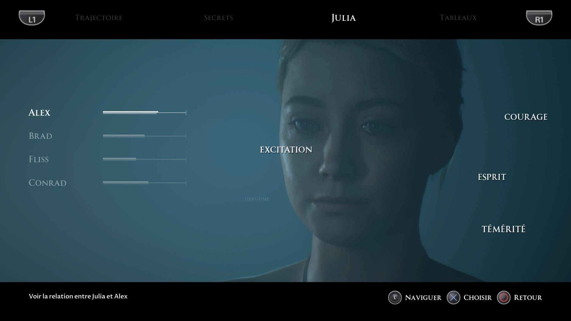 Le sentiment d’inachevé est donc réel et on sent que le studio a voulu faire les choses trop rapidement en reprenant la formule à succès d’Until Dawn. Car le jeu ne manque pas d’idées intéressantes, sur le papier : un système de vision qui permet de voir les différents futurs possibles des personnages a été repris mais il est mal exploité et finalement artificiel. Chaque personnage dispose aussi de différentes jauges permettant de visualiser les relations établies au fur et à mesure de l’aventure avec les autres membres du groupe, chacun possédant leur propre trait de caractère que le joueur pourra influencer en fonction de ses choix. Cela aurait pu être un bon point mais au final ça ne sert pas à grand chose, si ce n’est débloquer des choix supplémentaires mais sans réel impact dans le jeu ! Comme pour le psychologue dans Until Dawn, ici, le quatrième mur est brisé par Le Conservateur (NDLR : le personnage parle directement au joueur, et sait que c’est un joueur !), qui vient narrer nos faits et gestes tout au long de l’aventure, une très bonne idée, mais quelle tristesse d’observer que celui-ci n’apporte pas grand-chose… dans Until Dawn, le joueur répondait à cet interlocuteur et la dialogue avait un sens et faisait partie du jeu lui même. Cette conversation n’a désormais plus la même influence que dans l’idée initiale, et c’est bien dommage !