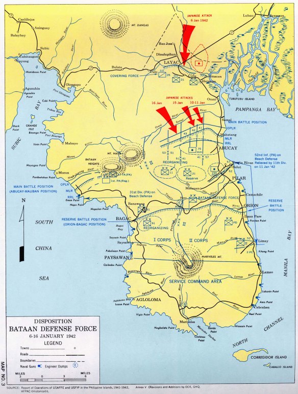 Dans la première partie de cet épisode 3, nous avions vu que le Général MacArthur avait évité le pire et avait réussi à replier ses troupes sur la presqu’île de Bataan. Il faut dire que son homologue japonais, le Général Homma avait plus envie de parader en vainqueur à Manille que de batailler. Lorsqu’il déambulait dans les rues de la capitale le 2 janvier 1942, il accorda aux forces américaines et philippines un répit pour se retrancher. 80 000 hommes se sont regroupés dans la péninsule de 50 km de long sur 20 de large. Les stocks de munitions sont bons mais les vivres doivent être rationnés et les médicaments manquent, notamment la quinine pour lutter contre le paludisme.