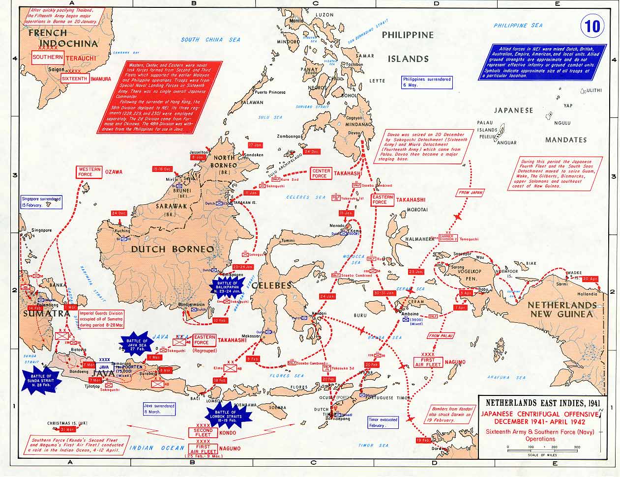 En janvier, les troupes japonaises rencontrent peu de résistance et leurs débarquements appuyés par leurs portes-avions permettent au Japon d’avoir le contrôle sur Bornéo et les Célèbes. A noter cet unique revers japonais dans la nuit du 23 au 24 janvier où l’US Navy réussit à couler 4 transporteurs et 1 patrouilleur. Furieux de la destruction des installations pétrolifères, les Japonais massacreront toute la population européenne de Balikpapan (à l’est de Bornéo).