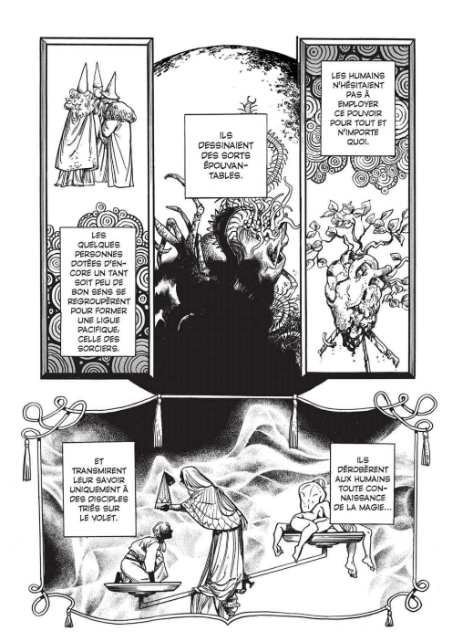 A différent moments, Kamome SHIRAHAMA laisse d’ailleurs des indices sur les côtés sombres de son manga. Petit à petit l’auteure nous fait découvrir l’univers de son histoire, où deux sociétés coexistent : d’un côté la majeure partie de la population qui ne peut utiliser la magie, et de l’autre celle des sorciers. Cette dernière possède son propre système de maintien de l’ordre avec la Milice Magique qui assure le respect des lois sur l’utilisation de la magie et lutte contre les actes terroristes de la Confrérie du Capuchon. A travers ces deux entités, la Milice et la Confrérie, la mangaka nous dévoile un monde magique coupé en deux. La Confrérie est composée de sorciers qui n’hésitent pas à avoir recours aux sorts interdis, contrairement aux sorciers normaux, et ne s’imposent pas de restriction. De plus ils ne dessinent pas leurs pentacles uniquement sur des objets inanimés, mais aussi sur des êtres vivants, tel que leur propre corps ou celui de leurs victimes, ce qui a pour conséquence de modifier entièrement la structure du corps ; ainsi ils peuvent devenir ce qu’ils veulent, comme le sort de pétrification utilisé sur la mère de Coco. Ils n’hésitent pas aussi à utiliser des sorts capables de modifier complètement un paysage.