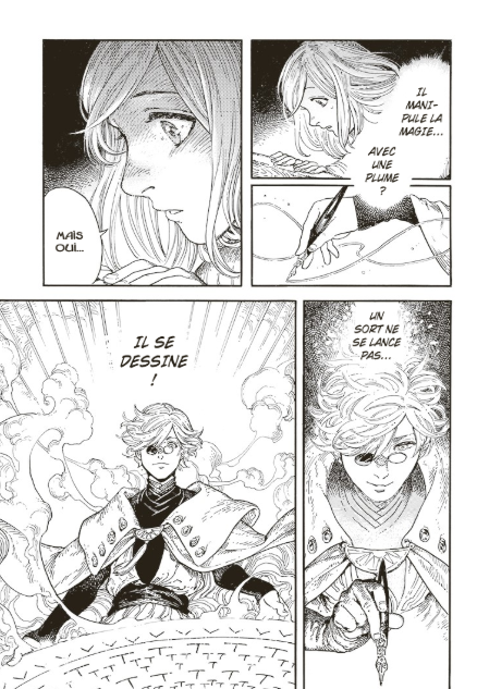 Forte de toutes ses expériences, autant sur le plan scénaristique qu’artistique, la jeune autrice parvient à donner à L’atelier des Sorciers une histoire d’une grande richesse, avec un univers vaste et bien construit, et une esthétique qui émerveille à chaque page tournée. En plus de tout donner dans le design de ses personnages, Kamome SHIRAHAMA parvient à insuffler beaucoup de réalisme à chaque paysage qu’elle dessine, qu’il s’agisse de milieux montagneux ou urbains. Chaque détail est magnifiquement réalisé, notamment à l’aide des jeux d’ombre et de lumière qui apporte de la profondeur et un relief qui donne vie à ses dessins. Un style qui évoque par moment le clair-obscur dans la peinture, ou parfois l’Art Nouveau de par son amour des lignes courbes dans les vêtements de ses personnages. Enfin on retrouve aussi des touches et références médiévales à plusieurs niveaux : le système de caste qu’elle instaure entre les magiciens et le reste de la population, la magie, certains points du chara-design, et enfin l’architecture des lieux avec l’utilisation d’éléments naturels récurrents comme la pierre, le bois, l’encre notamment pour la magie… Tout l’aspect esthétique de L’atelier des Sorciers reste cependant harmonieux et créé sa propre ambiance.