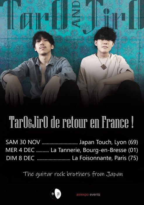 Les deux guitaristes japonais TarO&JirO, 7 ans après leur dernier passage chez nous, reviennent en France pour quelques dates : le samedi 30 novembre à Japan Touch (Lyon), puis le mercredi 4 décembre à La Tannerie (Bourg-en-Bresse) et enfin le dimanche 8 décembre : La Foisonnante (ex-Abracadabar) (Paris).